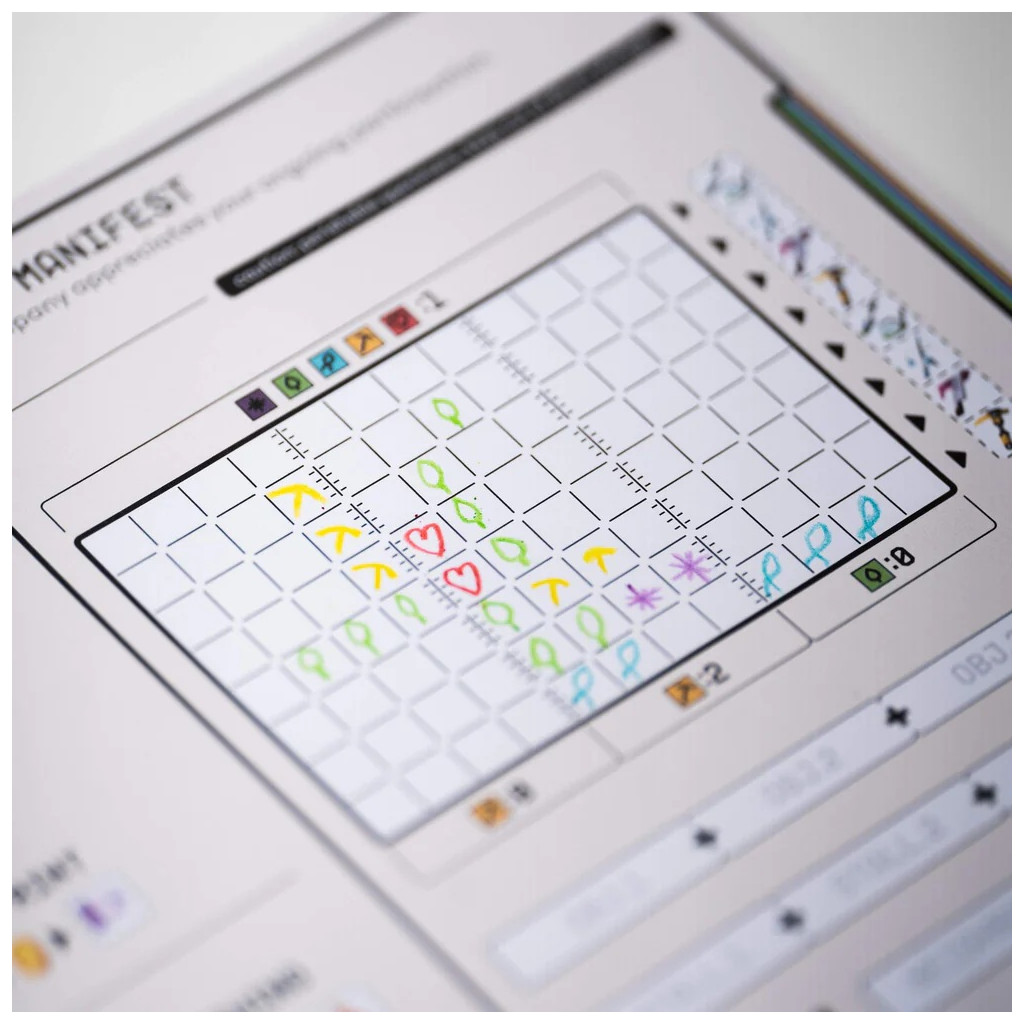 Each turn, all players use the same deck of action cards to simultaneously perform actions on their own game sheets.