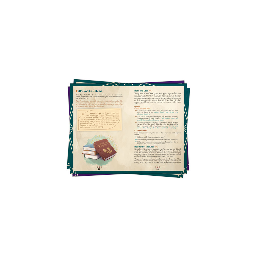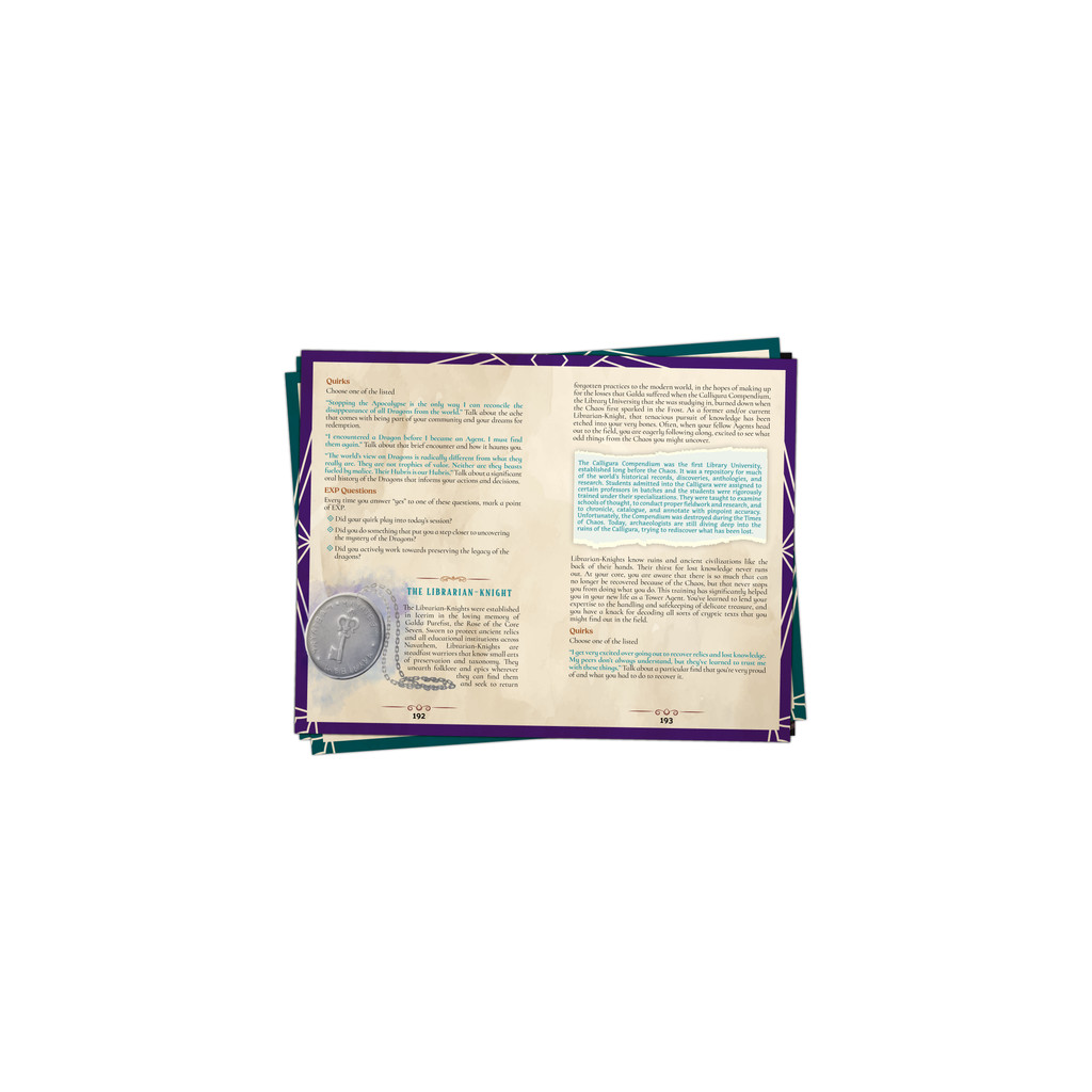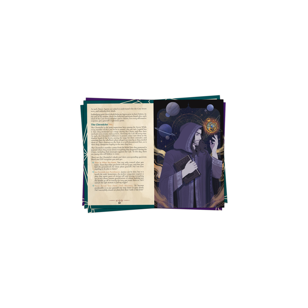 The handbook contains all the rules to play the game including the 7 Agent playbooks, the 5 Chaos Source Playbooks, The Movesets, a d100 table of threads for further interesting play, an intuitive advancement system, 5 stunning fully illustrated maps, more world lore, and a comprehensive guide to GMing for Navathem.