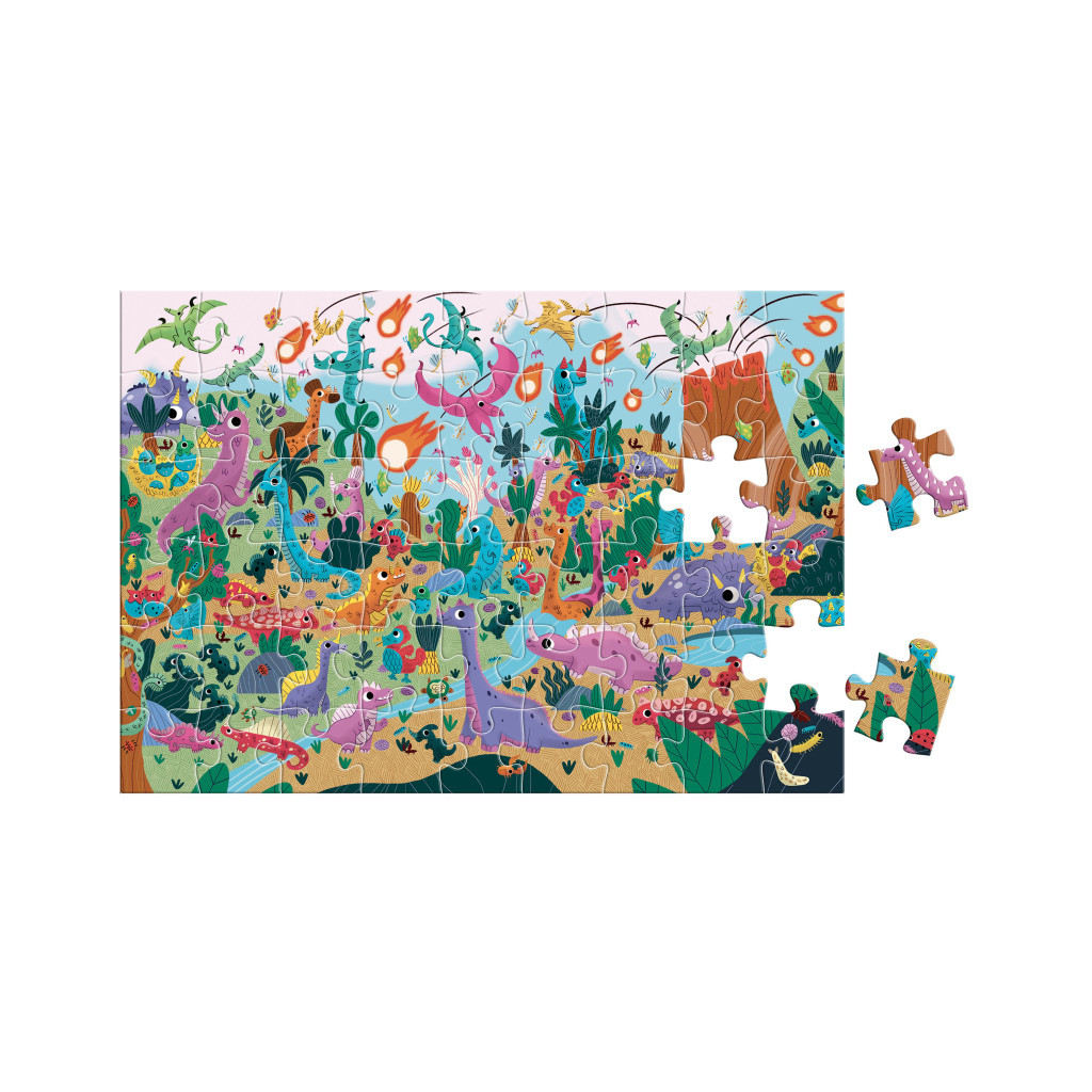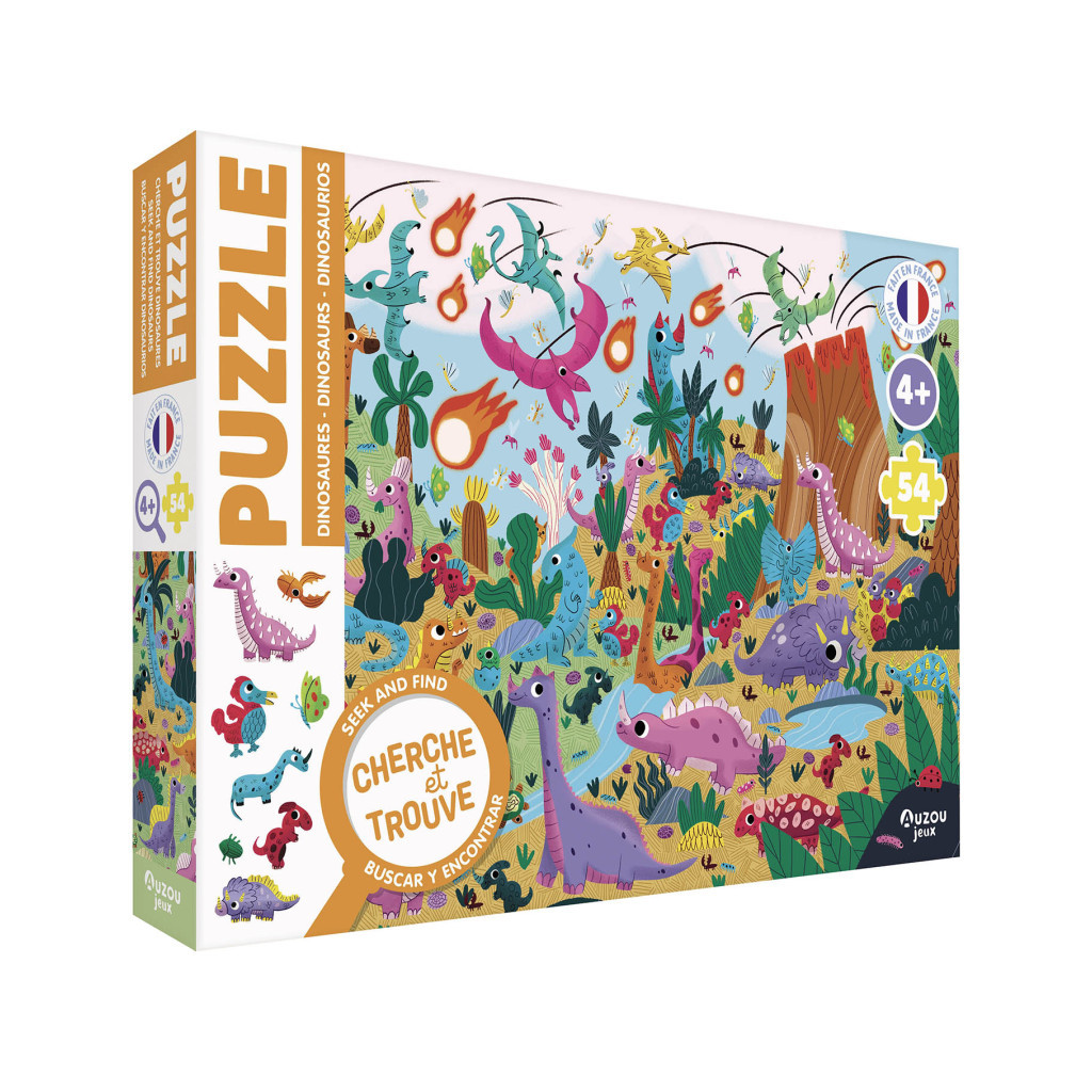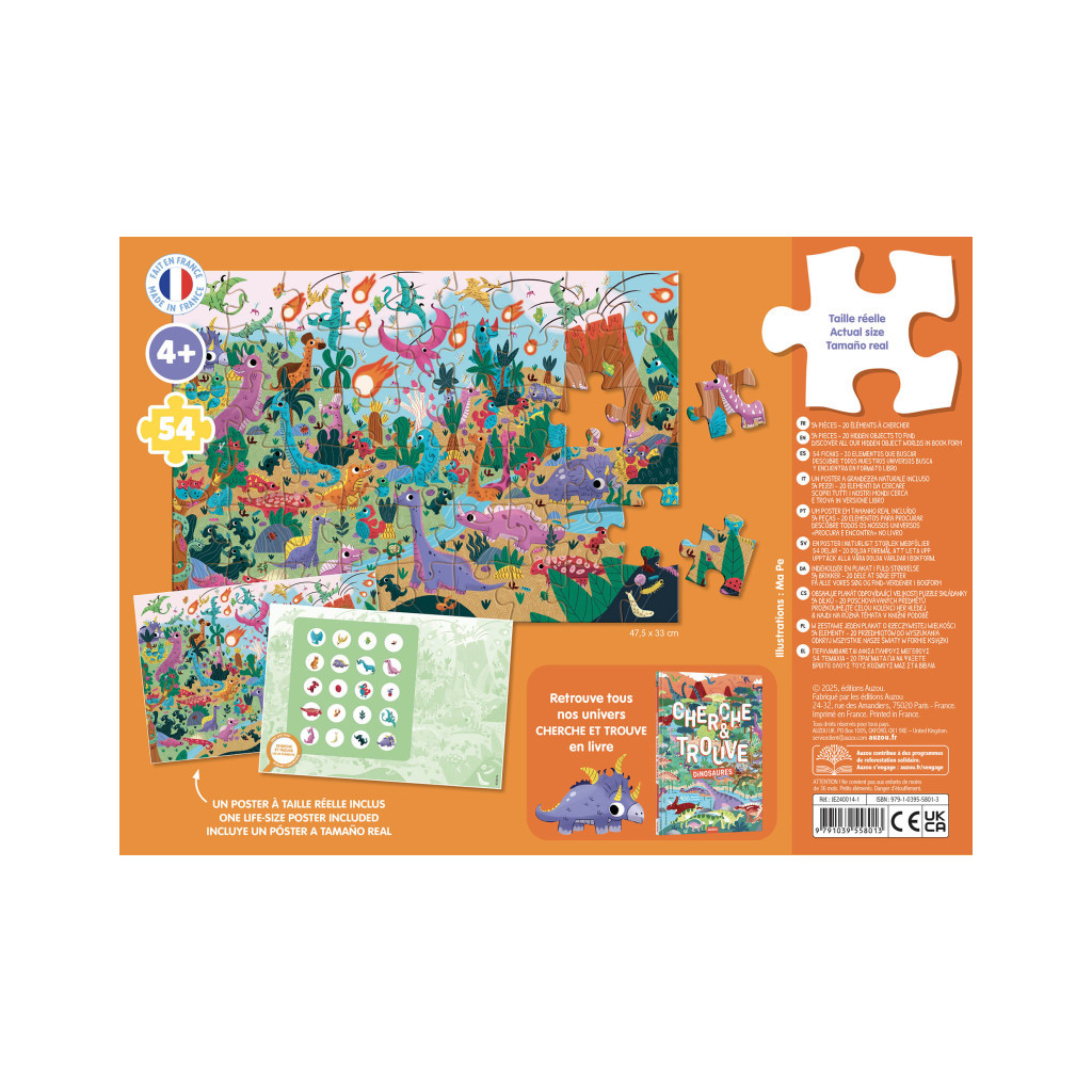 A beautiful seek-and-find puzzle featuring dinosaurs! Puzzle for ages 4 and up, made in France. The seek-and-find puzzle is a variation of the popular Seek-and-Find collection. Includes a poster: on the front, the lovely illustration; on the back, the items to search for and spot in the puzzle!