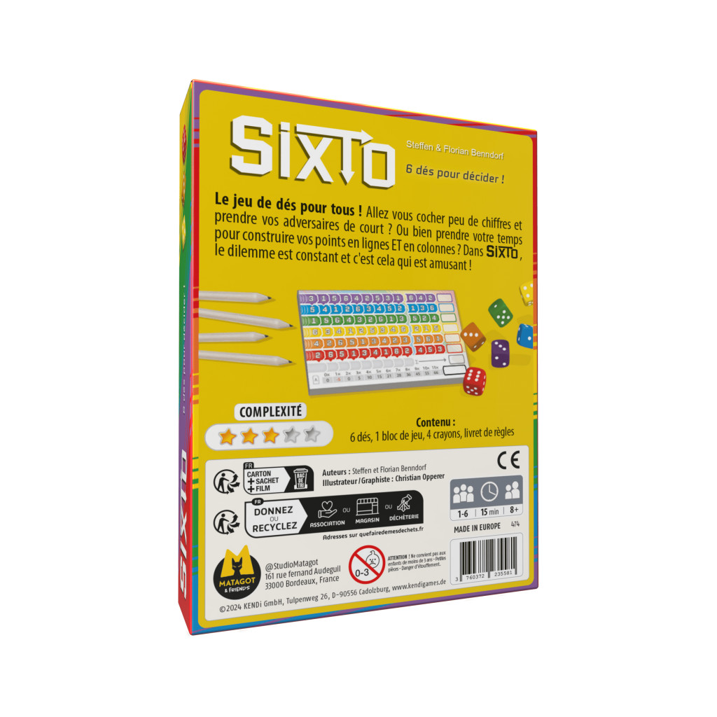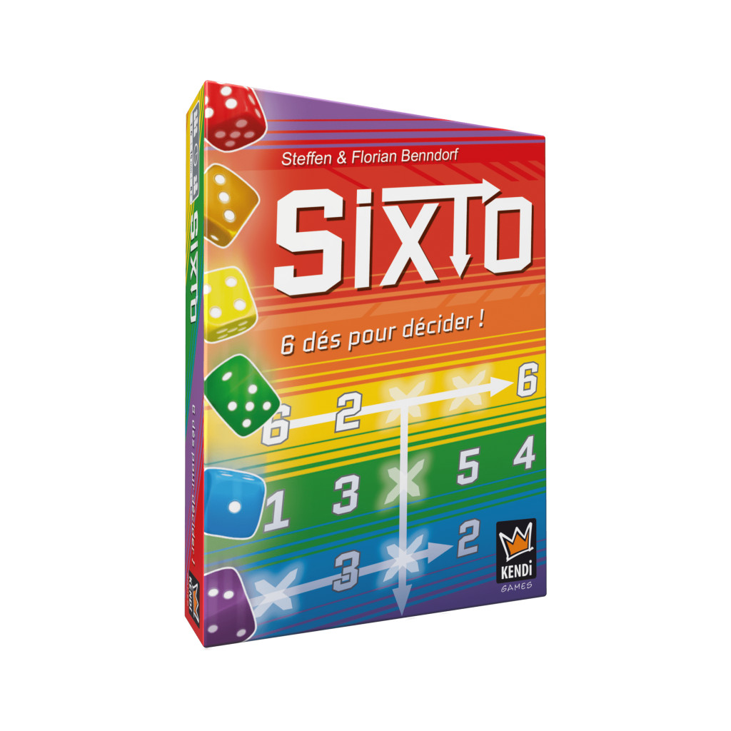 Your goal in Sixto is to mark off as many numbers as you can...although a lone mark counts against you, so don't mark carelessly. Each player gets their own player sheet, which features six rows of numbers, each in a different color. The row contains the digits 1-6 in a random order, and each player should have a different sheet from among the twelve designs in the box.