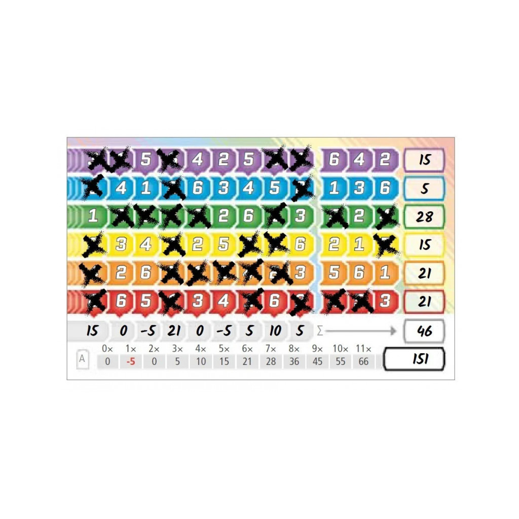 On a turn, the active player rolls the six colored dice, one for each of the colored rows. If they don't like the results, they can re-roll all six dice once. After the final die roll, for each die, each player can choose to mark off the leftmost available number matching the die result, skipping over any intervening numbers. Skipped numbers cannot be marked in the future. Thus, on each turn, each player makes 0-6 marks on their player sheet. The active player then passes the dice left.
