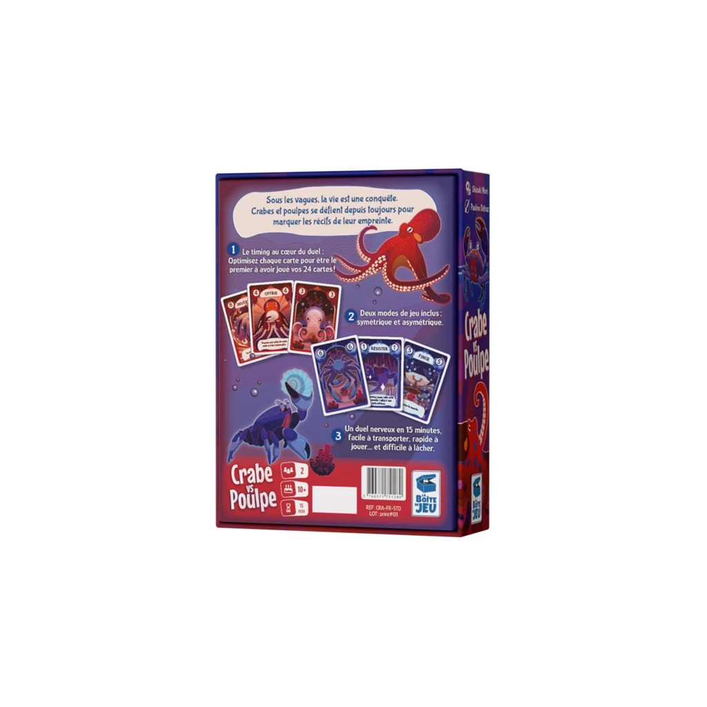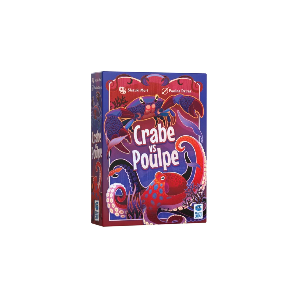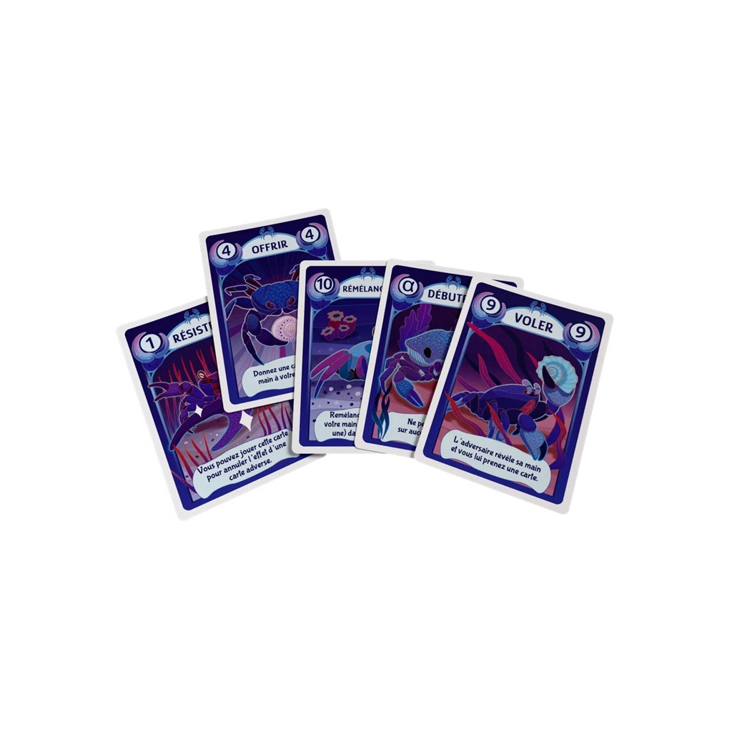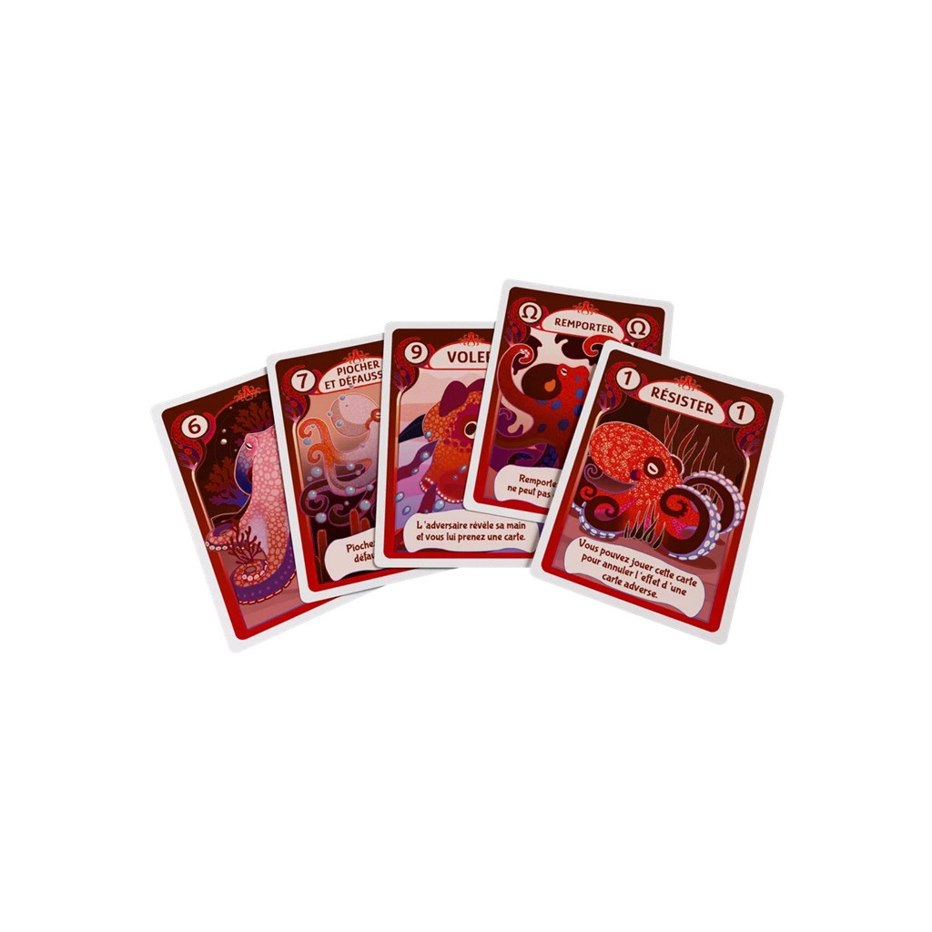 Crab vs. Octopus is a discard game for 2 players. A game is played in several rounds. In each round, players take turns until one of them passes, either because they can no longer play or because they choose to stop. At the beginning of each round, players fill their hand to 5 cards.