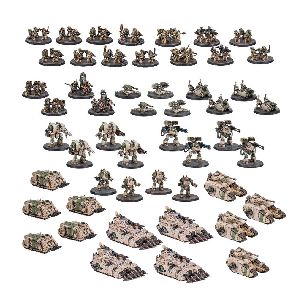 This multipart plastic kit builds 131 individual epic scale miniatures, which assemble 51 models for your Legiones Astartes armies in games of Legions Imperialis. The core of the force is a large block of infantry, heavy infantry, and command units, supported by heavy weapons platforms, Dreadnoughts, transports, and battle tanks. It's perfect for starting a new army or bolstering an existing collection, and you'll save money compared to buying the kits individually. The tanks each have a selection of cosmetic and weapon options, allowing you to tailor your force to your liking.