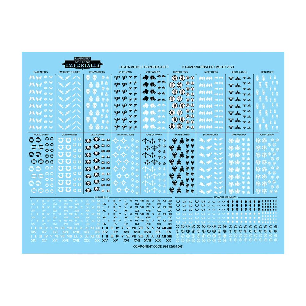 The kit also comes with 3x Legion Vehicle Transfer Sheets, each containing 1,130x high-quality waterslide transfers, including markings for all 18 Legions, numerals, and honour markings.