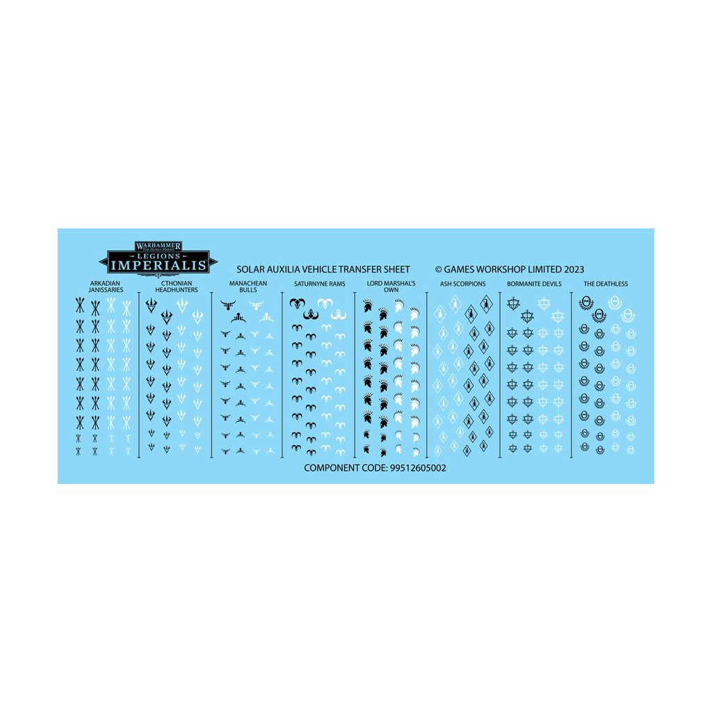 The kit also comes with 3x Solar Auxilia Vehicle Transfer Sheets, each containing 288x high-quality waterslide transfers to decorate your miniatures. There are markings for Arkadian Janissaries, Cthonian Headhunters, Manachean Bulls, Saturnyne Rams, Lord Marshal’s Own, Ash Scorpions, Bormanite Devils, and The Deathless regiments.
