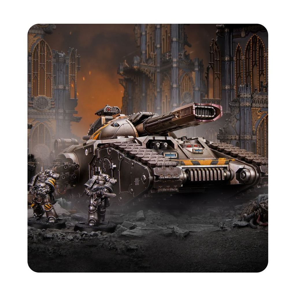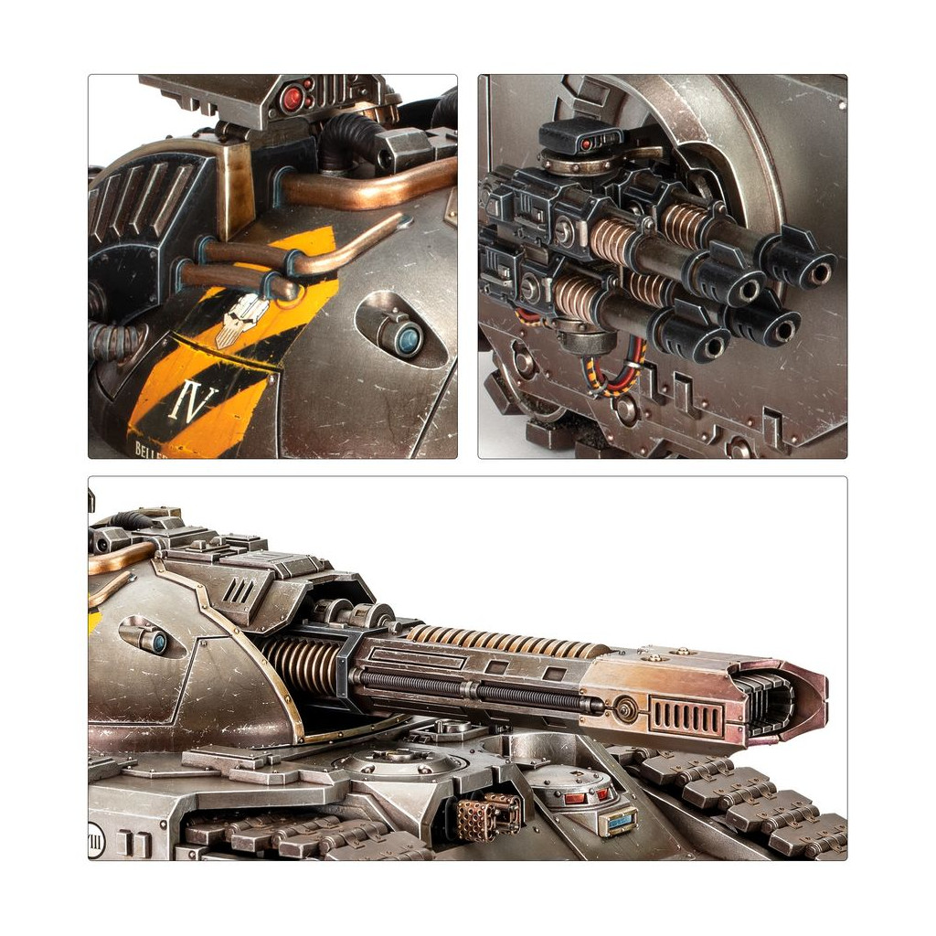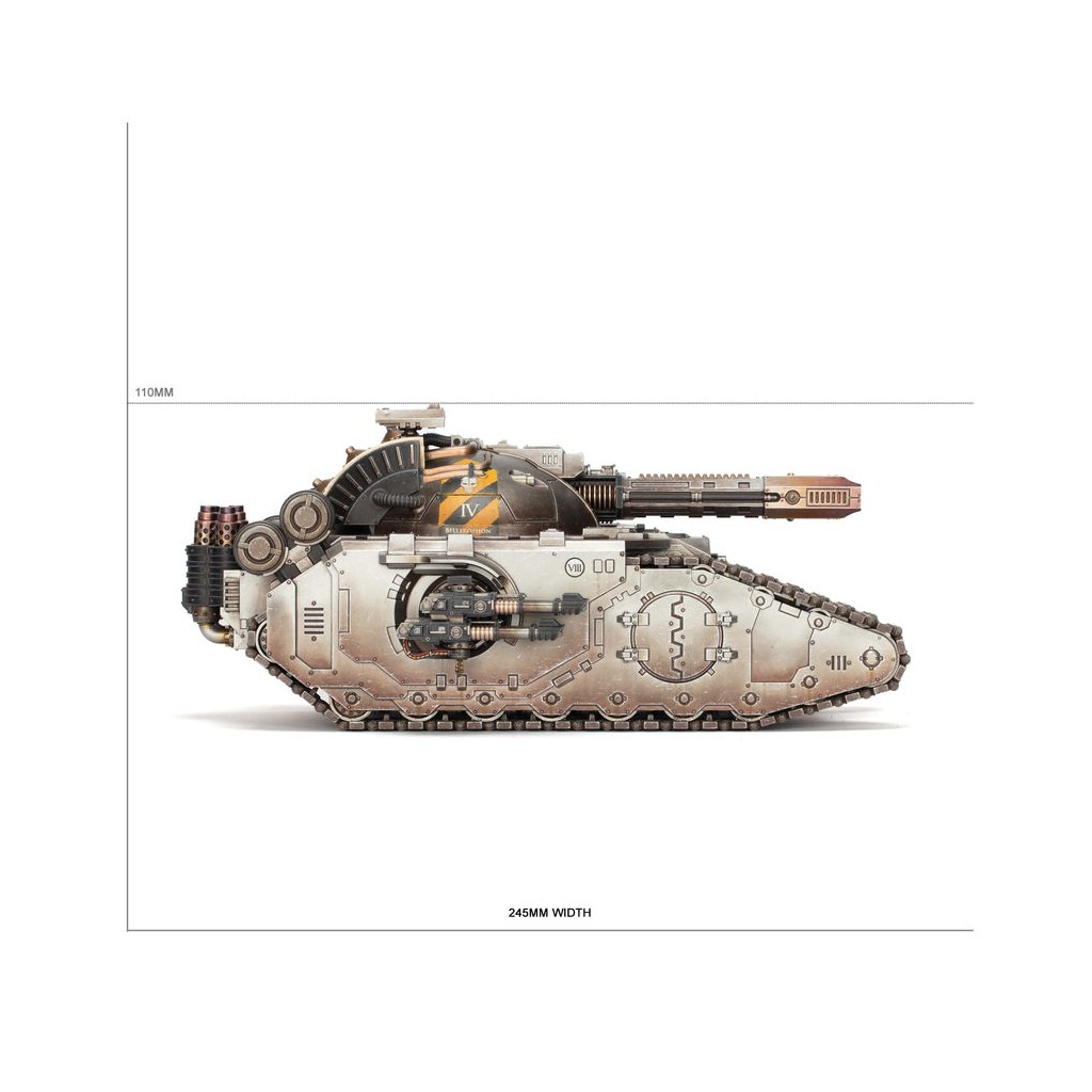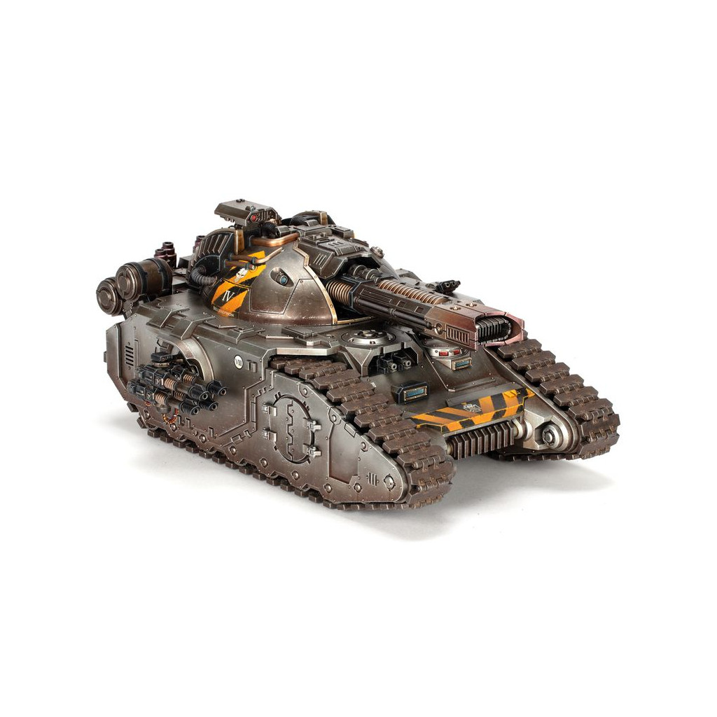 The Glaive is a super-heavy tank pattern based on the Fellblade, outfitted with a potent volkite carronade, a device of the Mechanicum whose design is said to have originated on Mars during the wars of the Age of Strife. When it fires, multiple targets are struck down by its ravening beam before even a portion of its energy is dissipated.