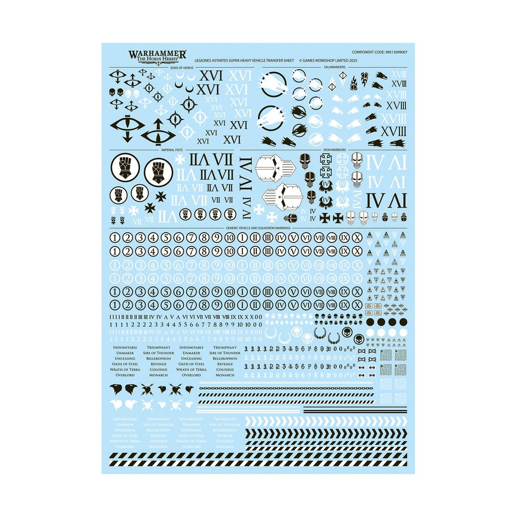 This kit is supplied with a Legiones Astartes Super-Heavy Vehicle Transfer Sheet that contains 718 high-quality waterslide transfers. These include Imperial Fists, Sons of Horus, Salamanders, and Iron Warriors icons, plus numbers and other markings to decorate your tank.