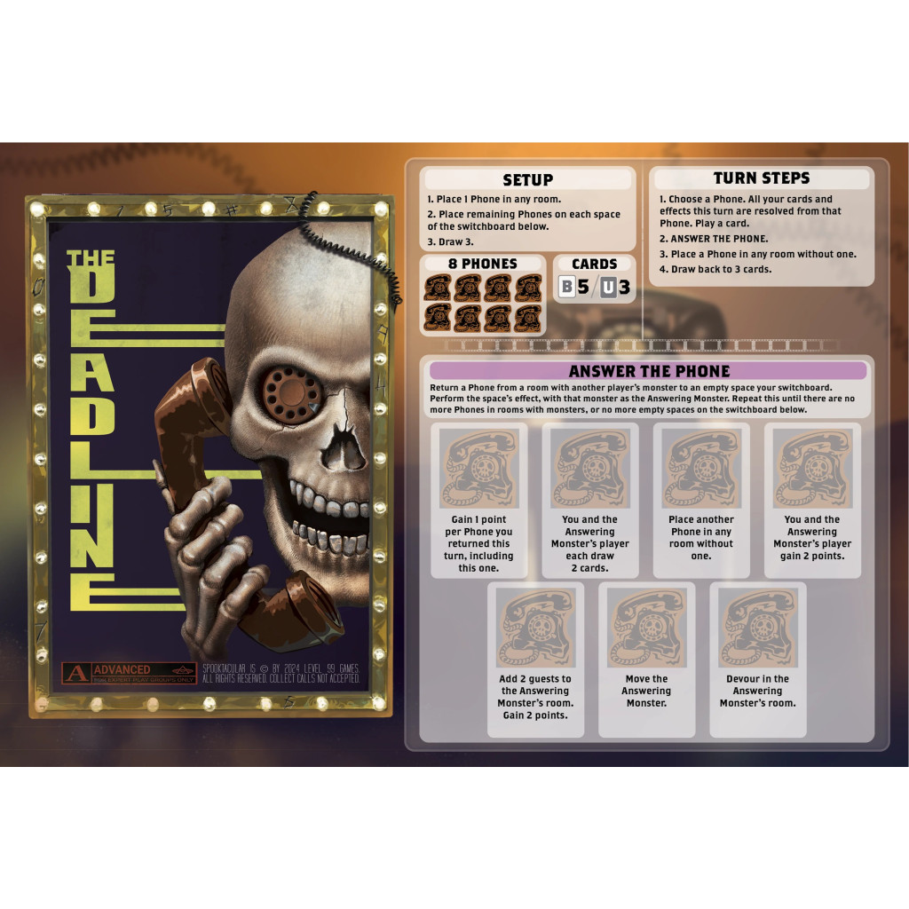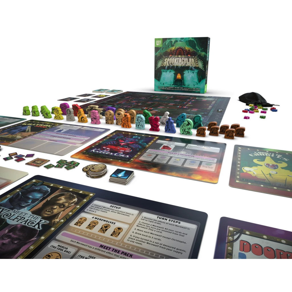 Spooktacular is played in multiple rounds. Players perform their monster's actions in order, then pass the turn to the player on their left. Playing cards, adding guests, moving, scaring, devouring, and interacting with your monster's unique abilities are common actions you can take during your turn.