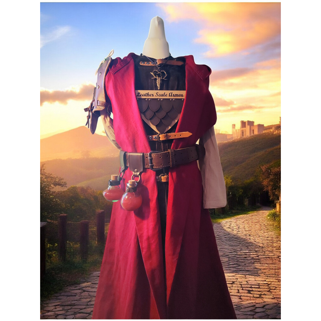 Each piece is made in our French workshop. The final look fits naturally into the outfit of an alchemist, herbalist, poisoner, merchant or wandering adventurer. It can carry potions, elixirs, spices, oils or any non-food liquids intended for gameplay.