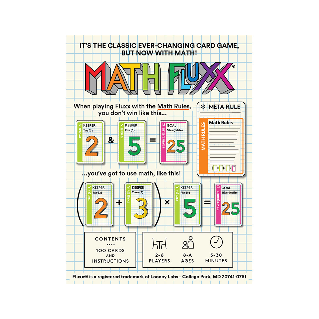 - MATH MADE FUN: What makes Math Fluxx unique is its fun blend of math and strategy. It challenges players to think critically and creatively as they combine numbers and apply operations to achieve the current Goal. It’s a perfect introduction to math in a casual, enjoyable way!