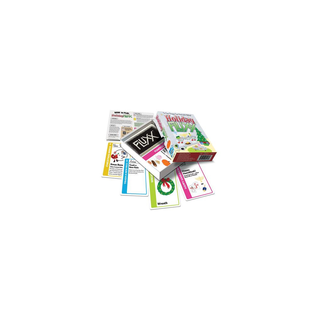 Celebrate the most wonderful time of the year with Holiday Fluxx! This festive edition of the ever-changing card game is perfect for spreading cheer and creating unforgettable memories with family and friends. Featuring holiday themes like Halloween, Thanksgiving, Hanukkah, Christmas, Yule, Kwanzaa, and New Year’s Eve, Holiday Fluxx brings joy and laughter to every gathering.