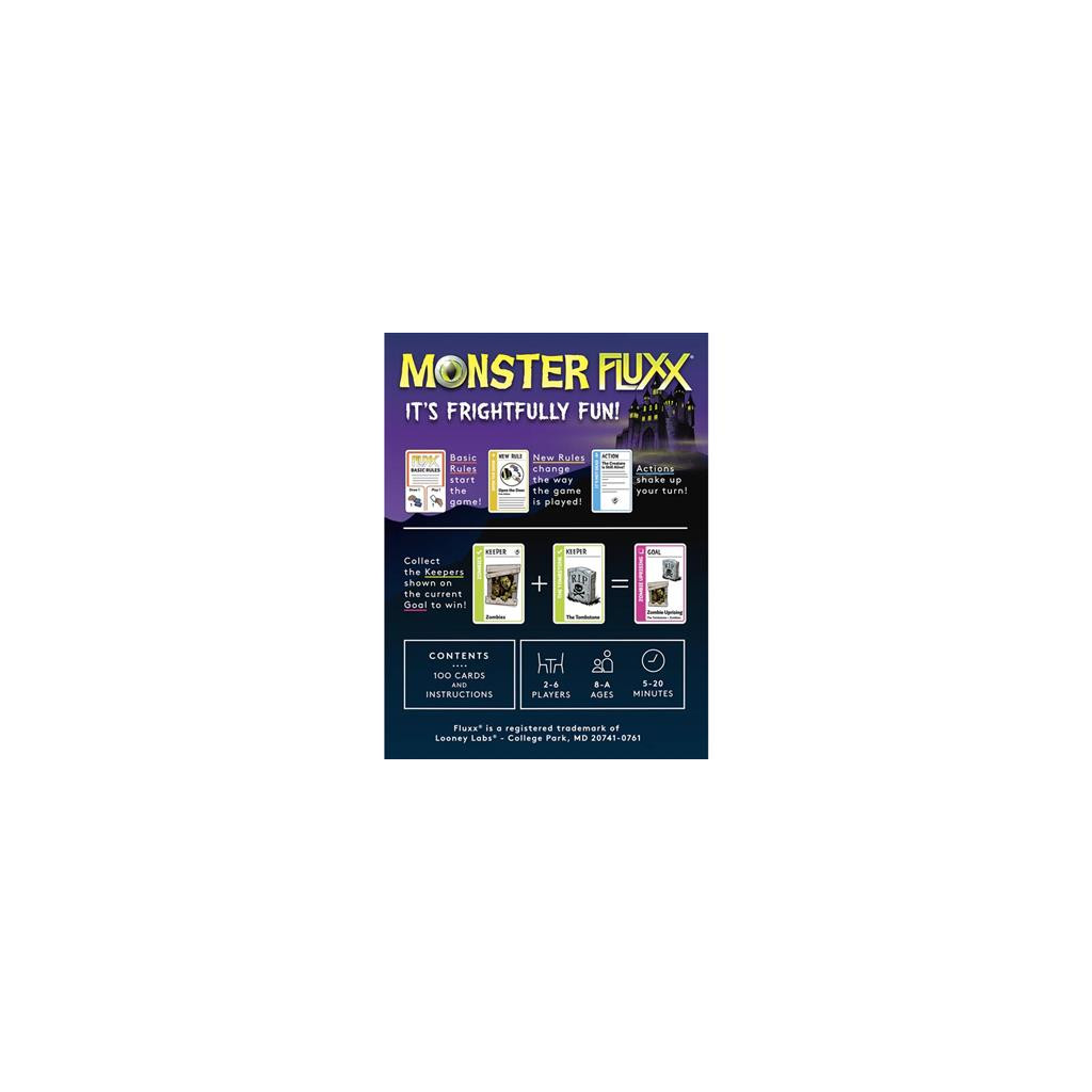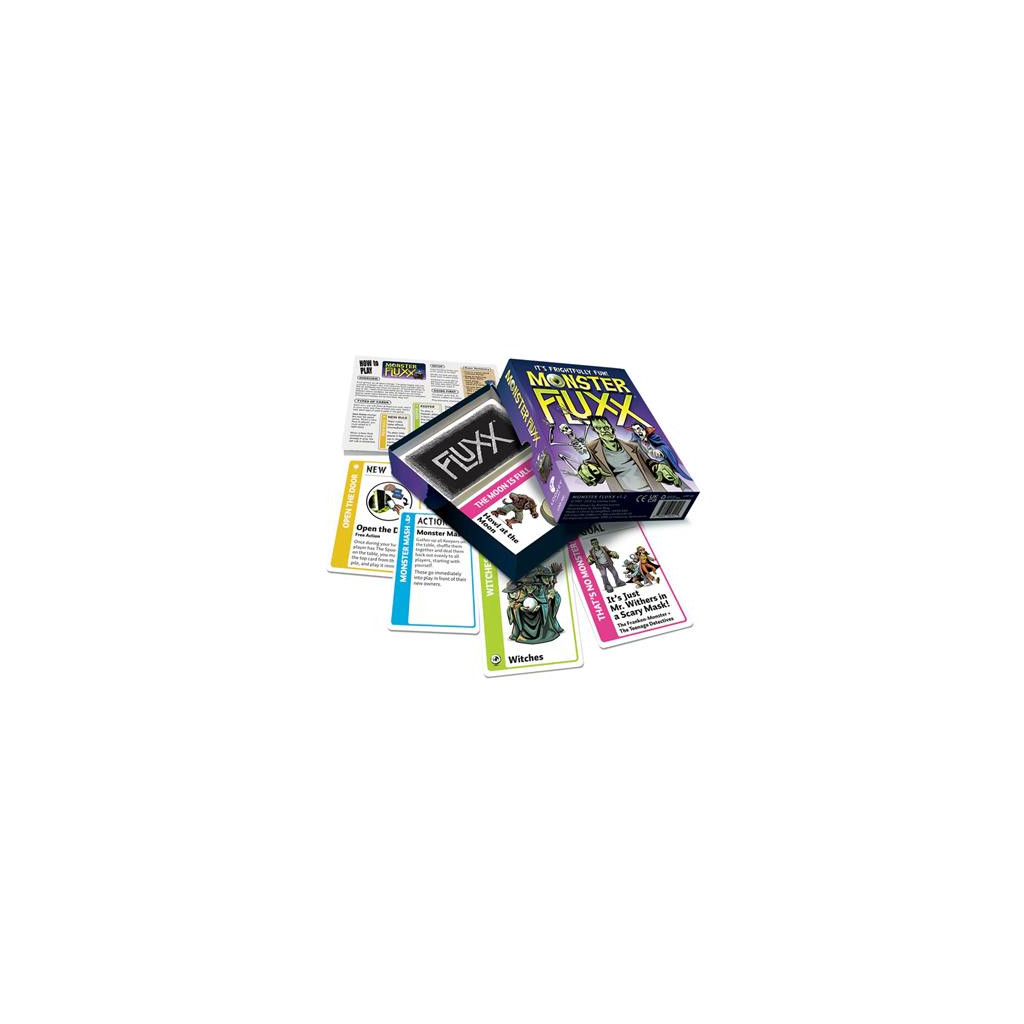 Get ready to unleash some frightful fun with Monster Fluxx! This spooky edition of the wildly popular Fluxx card game brings classic monsters to life, making it perfect for fans of Halloween, retro horror, and light-hearted strategy games. With zombies, vampires, werewolves, and more, players will enjoy chasing down the right combinations of Keepers to complete ghoulishly themed Goals, all while navigating ever-changing rules.