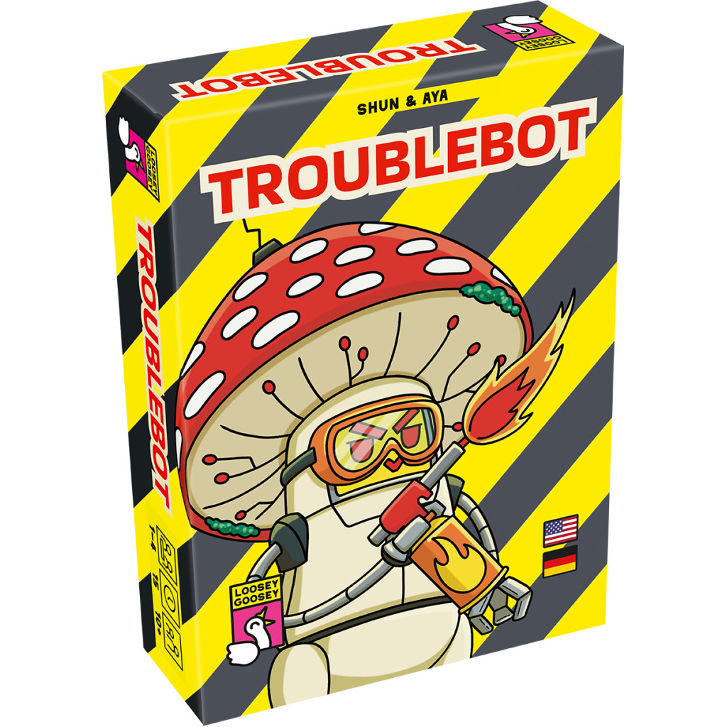 Troublebot is a lean, mean card game of many small but meaningful decisions. Whenever it is your turn, you get to pick up a new shroombot. Then you play one of the two shroombots in your hand and perform its action. While most effects help you take care of your seedlings, some will cause the other players trouble. If you have the most valuable seedlings in the end, you win.
