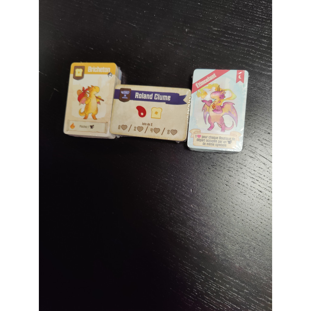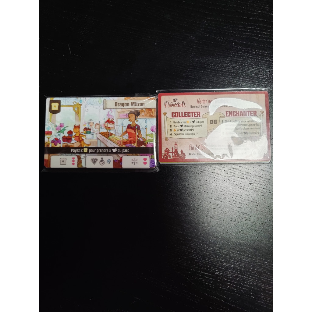 In Flamecraft, 2-5 players take on the role of Flamekeepers, gathering items, placing dragons and casting enchantments to enhance the shops of the town. Dragons are specialized (bread, meat, iron, crystal, plant and potion) and the Flamekeepers know which shops are the best home for each. Visit a shop to gain items and a favor from one of the dragons there. Gathered items can be used to enchant a shop, gaining reputation and the favors of all the dragons in the shop. If you are fortunate enough to attract fancy dragons then you will have opportunities to secure even more reputation.