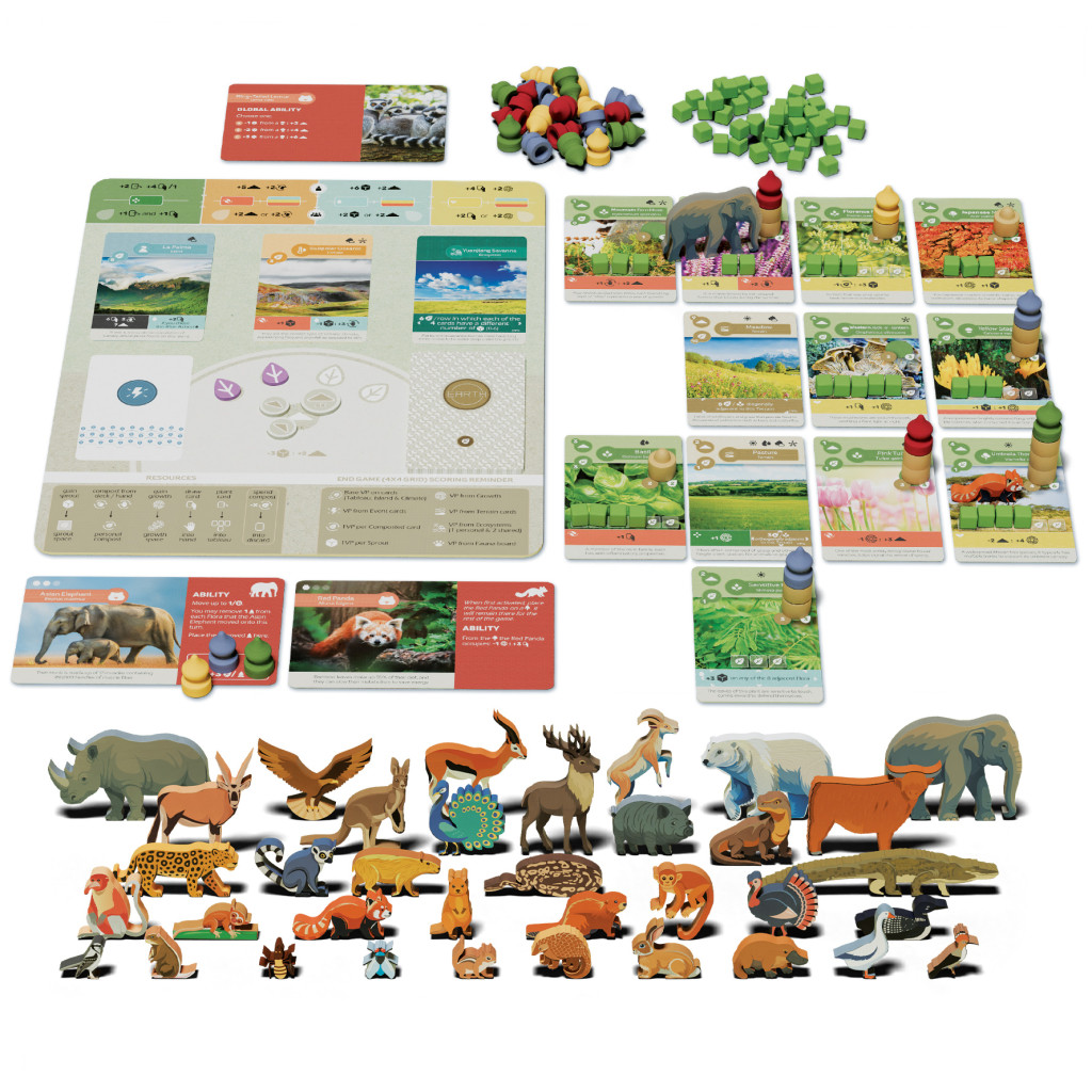 Continue to build your island, a 16-card tableau, by adding 36 Animal cards and 56 beautiful tokens. These tokens bring asymmetry between players thanks to their individual abilities, but also a new dimension to your games thanks to the collective ability of the chosen animal.