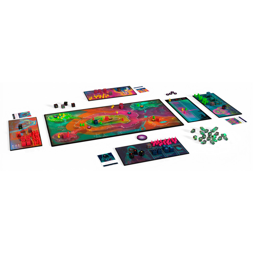 Draft action dice to obtain resources, deploy or maneuver your troops, and attack your opponents, all while ensuring your dominance over the different regions of a neon-colored game board. Thanks to each faction's asymmetrical abilities, Wroth is full of strategic possibilities!