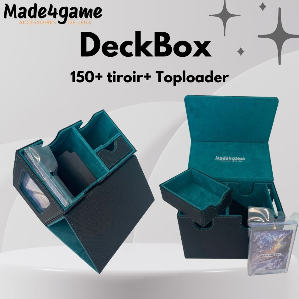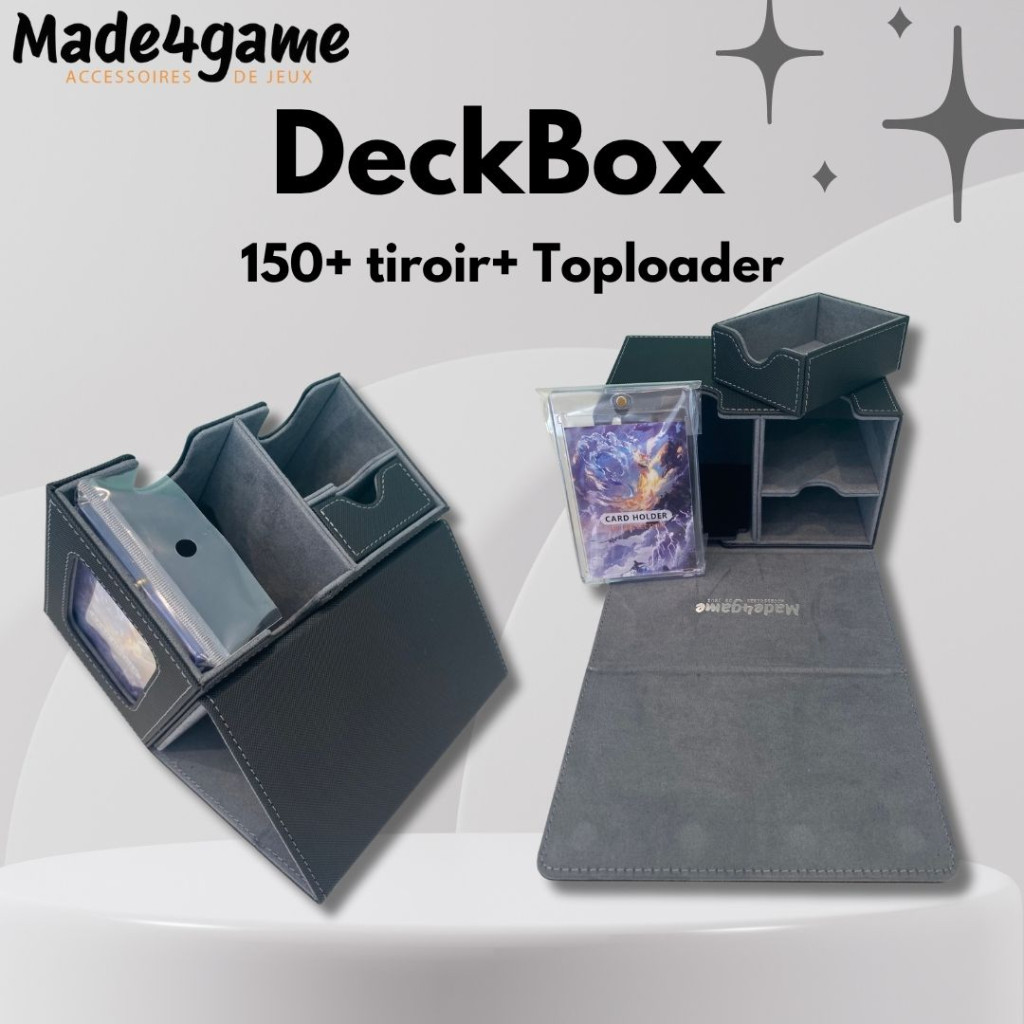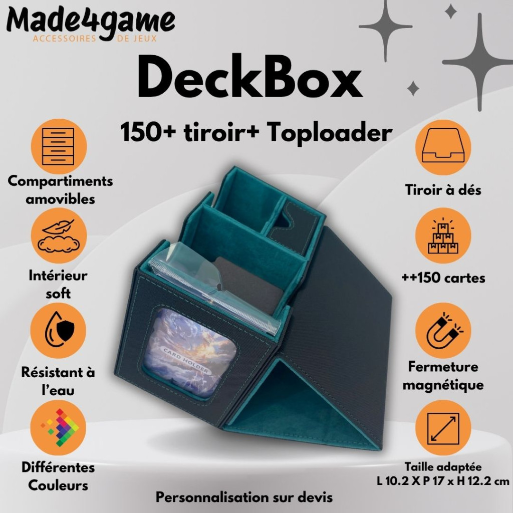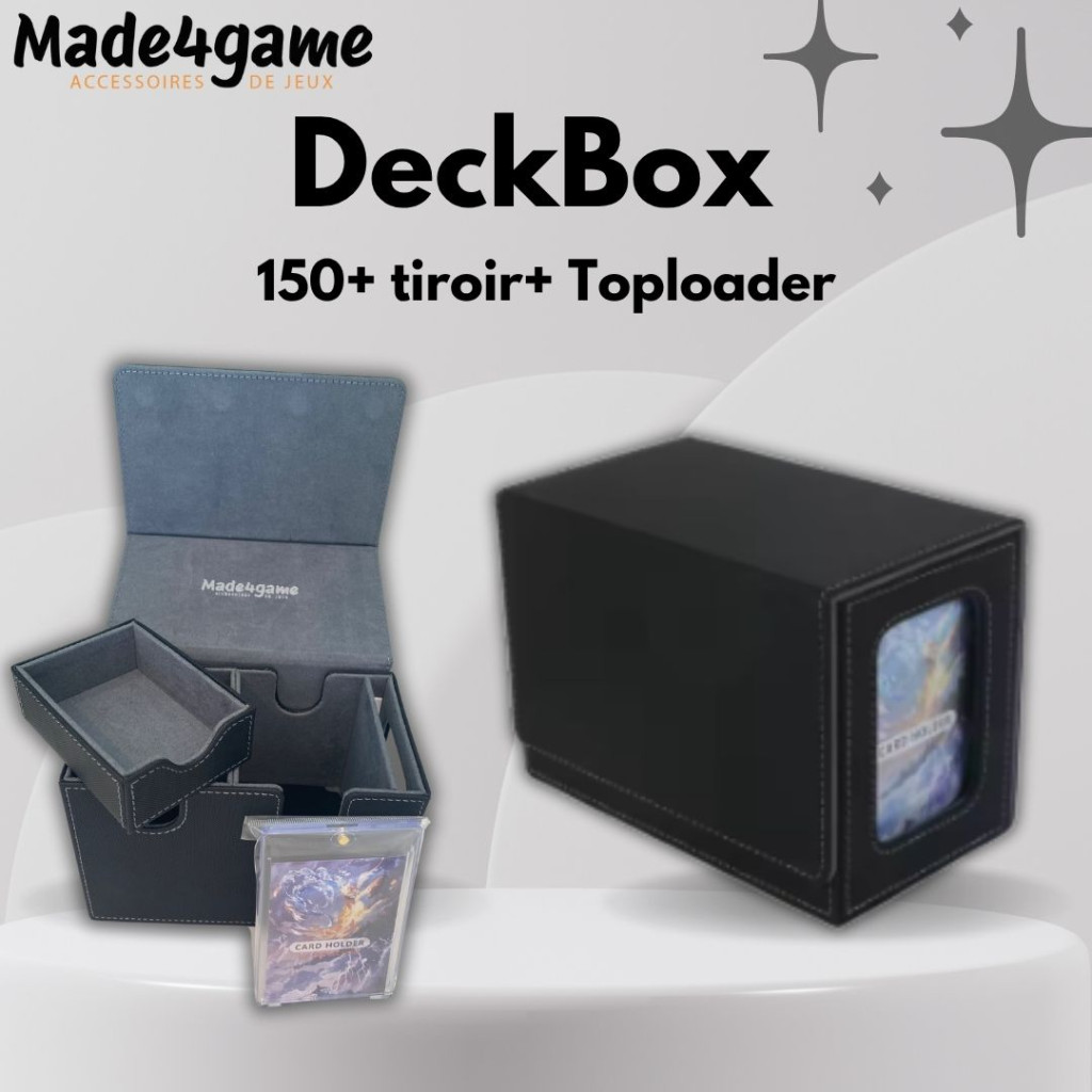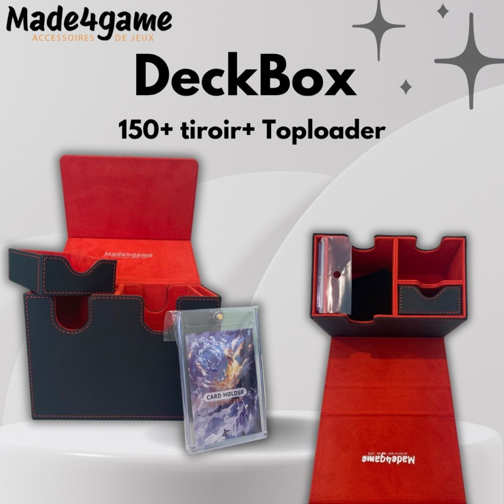 An all-in-one box for any TCG player in the “commander” version: it lets you store your cards, so you can transport them safely and easily, or store them under cover.