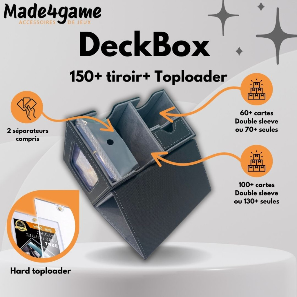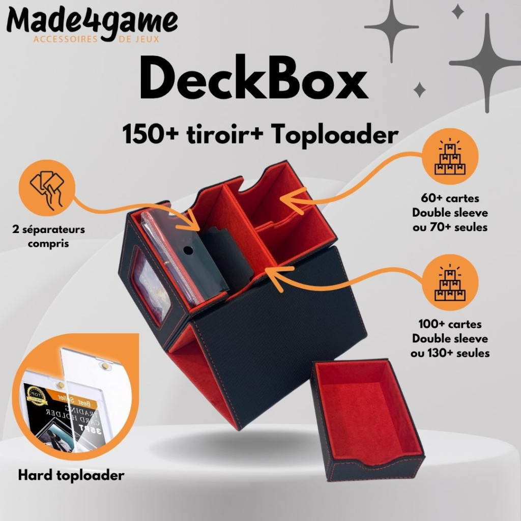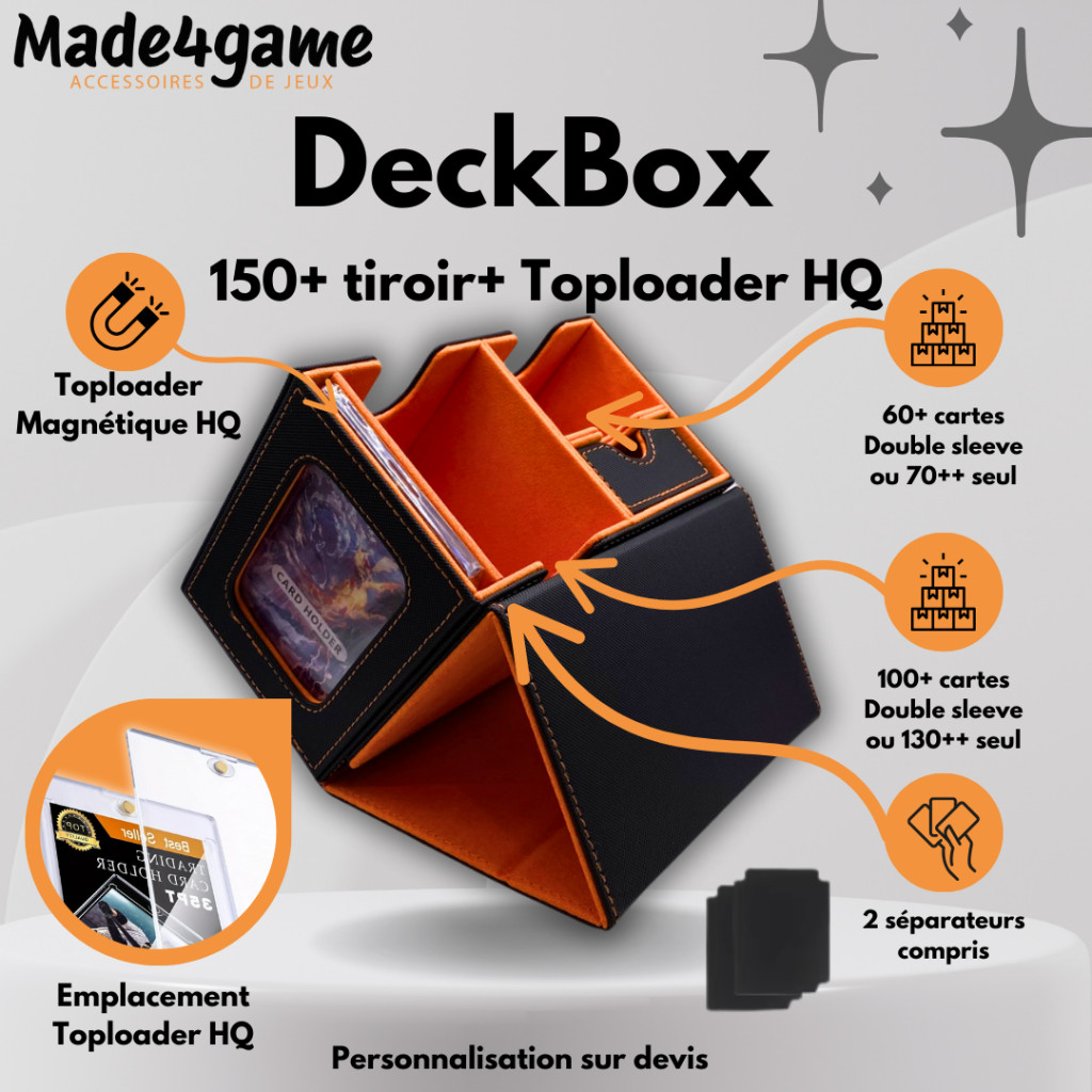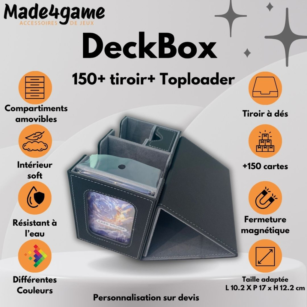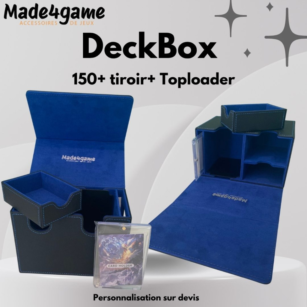 An all-in-one box for any TCG player in the “commander” version: it lets you store your cards, so you can transport them safely and easily, or store them under cover.
