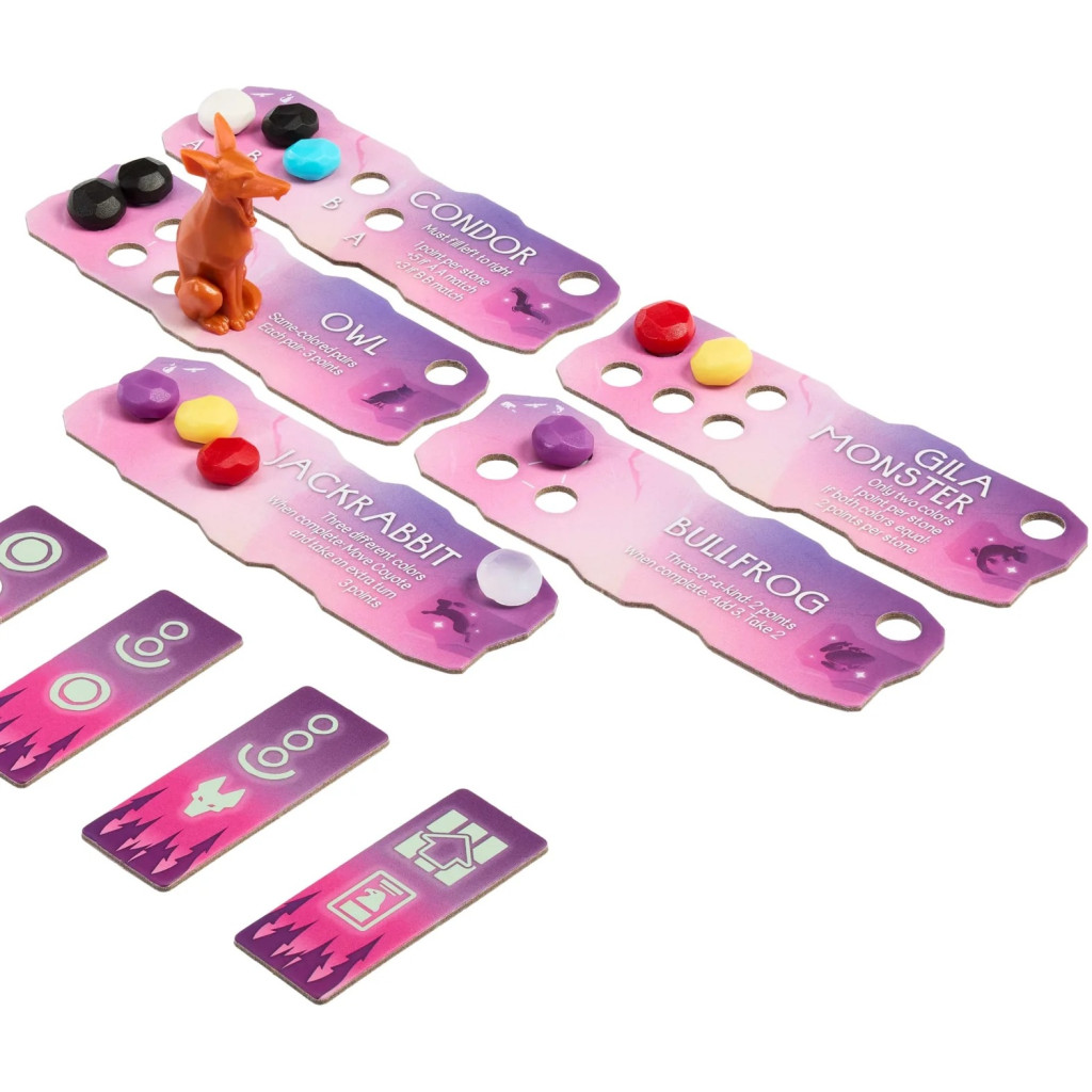 On your turn, you use your action tiles to add and take stones from the bowl, activate powerful spirit power cards, and move Coyote to block your opponent. Special iridescent spirit stones can double your score, but they also close any animal board you place them on.