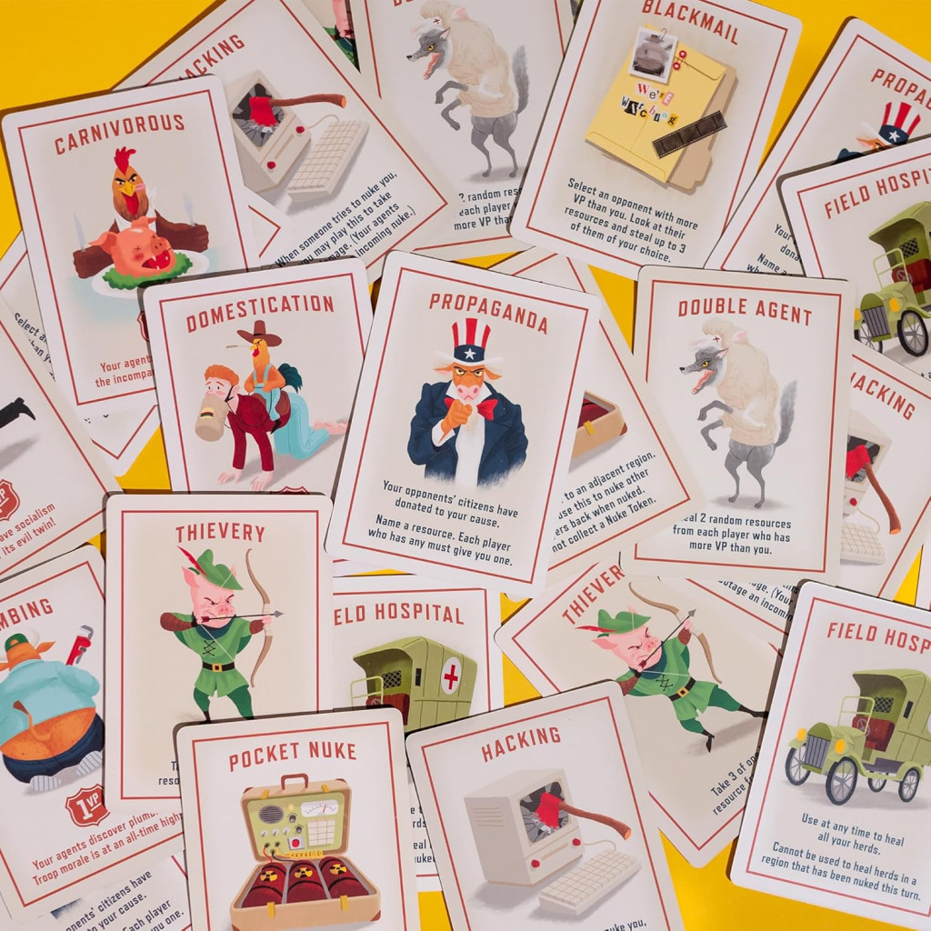 Farms Race is a strategy game that parodies peaceful Eurogames like Catan and Agricola. Players play as the Supreme Leader of a species of farm animal racing to accumulate 10 Victory Points by building Barns and Armories, recruiting Spies, building the most nukes, and conquering opponents' regions with their herds.
