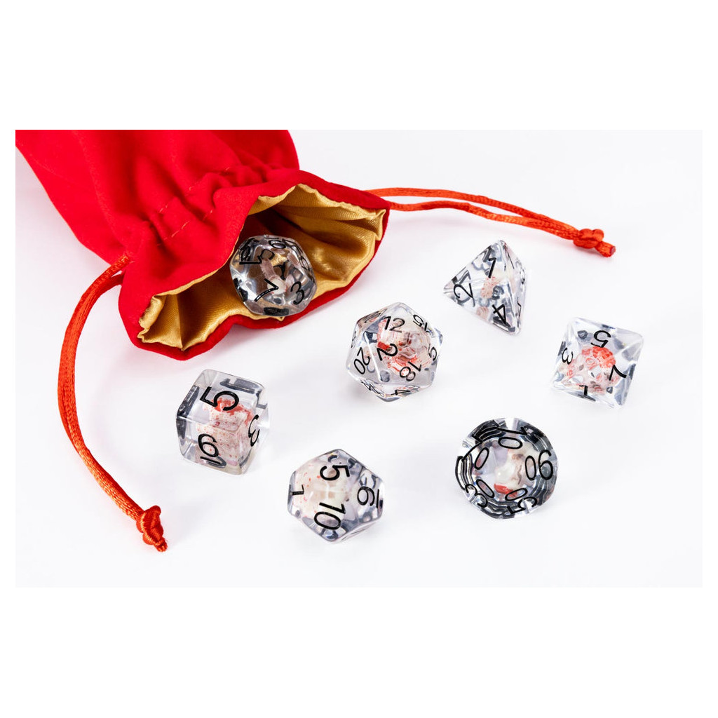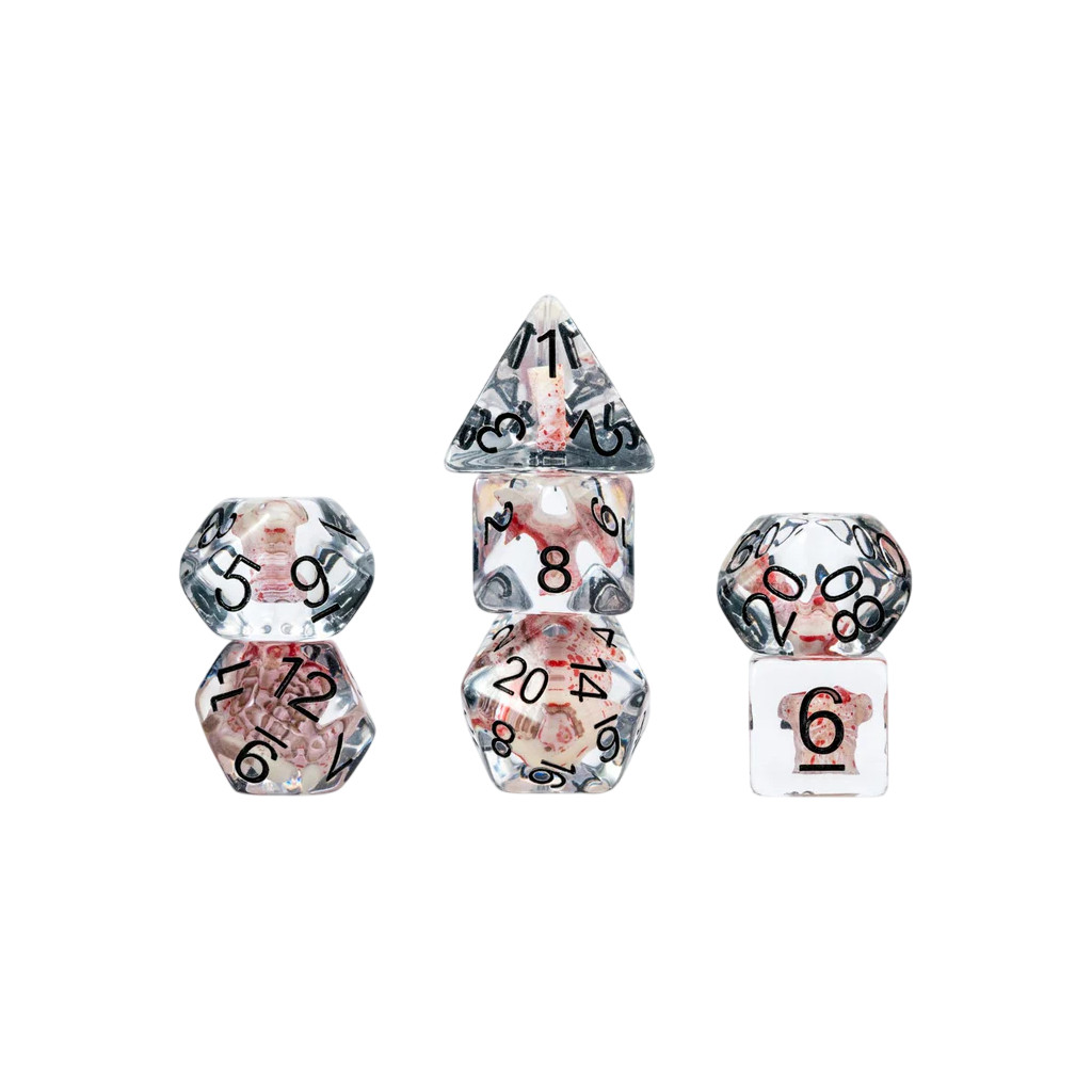 Calling all Walking Dead enthusiasts and collectors! Introducing the ultimate inclusion dice set with dismembered zombie parts to enhance your gaming sessions! This gruesome set features a detailed zombie head in the D20 and guts, arms and legs in the other dice!