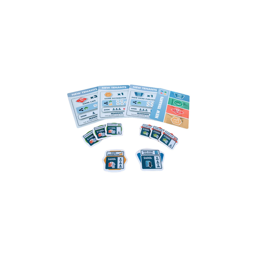 Promo created to celebrate the retail launch in Feb 2022 features a unique set of 4 new tenant cards and 8 corresponding tenant tokens with a special boardgame theme. Tenants: Game Cafe, Game Distributor, Indie Game Publisher, Boardgamer