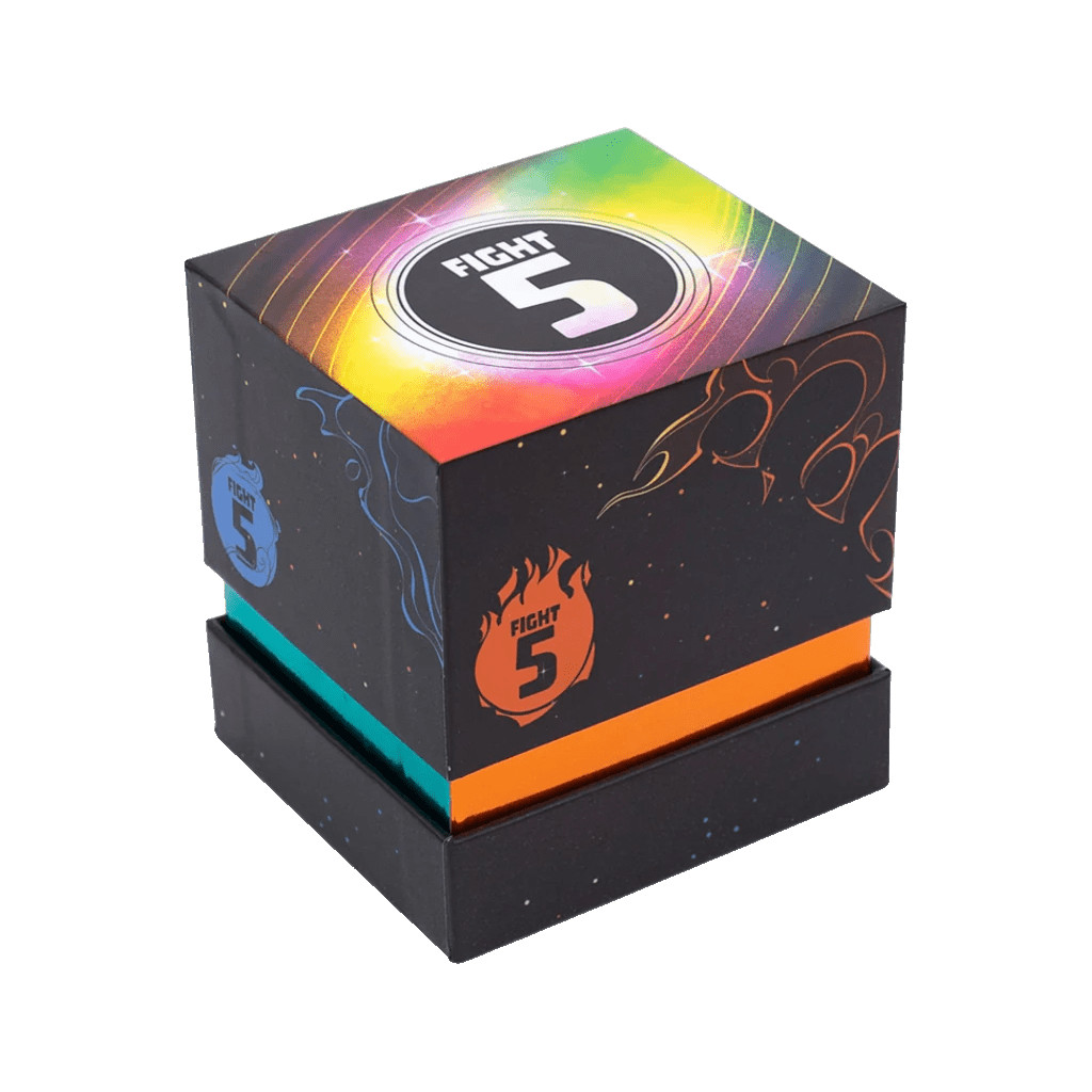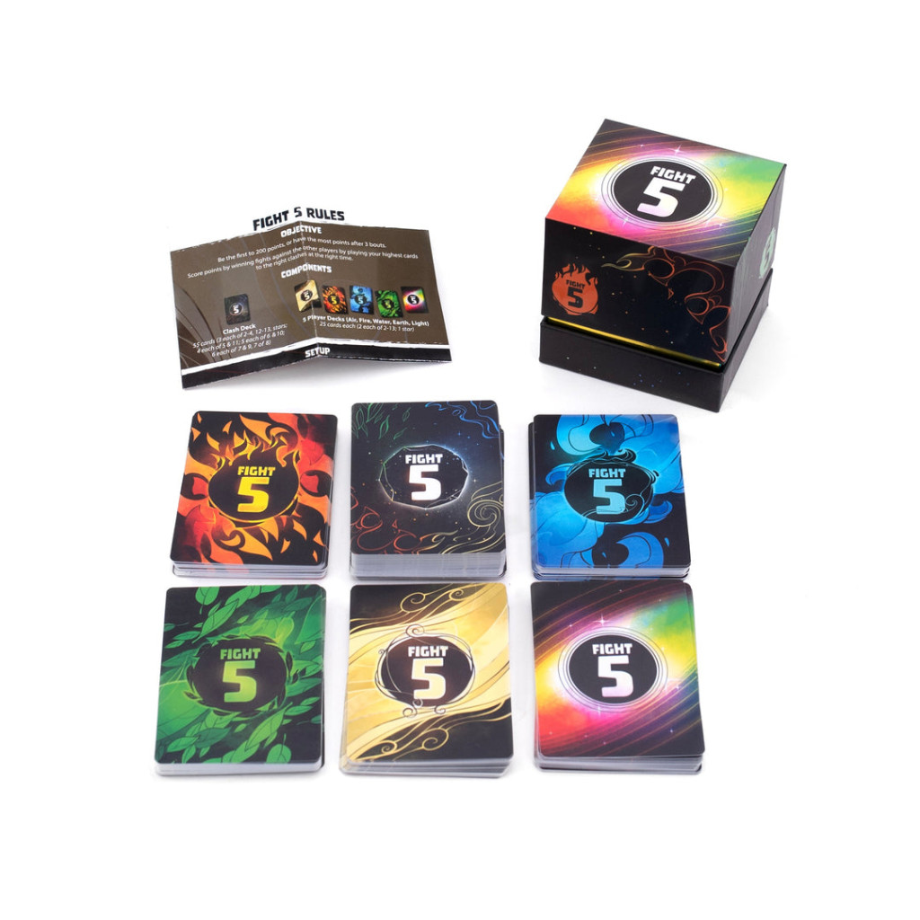 From the minds of Aaron Hein and Manny Trembley, Fight Five is an elemental tug-of-war for 2-5 players. In each of the five rounds, players will draw five cards and challenge their opponents for control of five different stacks. Win the clash and take the cards for endgame scoring! Did you tie? Then that stack only grows bigger (and more valuable) for the next clash.