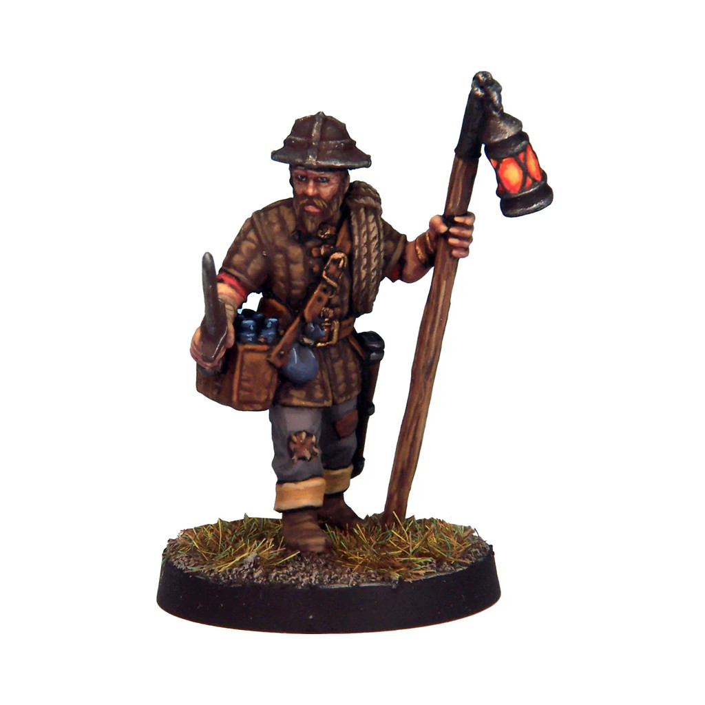 This figure represents a nightwatchman, or private security guard, typical of those employed by wealthy warehouse proprietors. He wears a padded leather jerkin and steel kettle helmet. He is armed with a shortsword, and he carries a coil of rope and a lantern mounted on a pole.