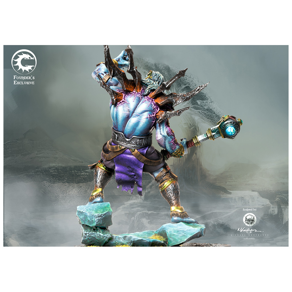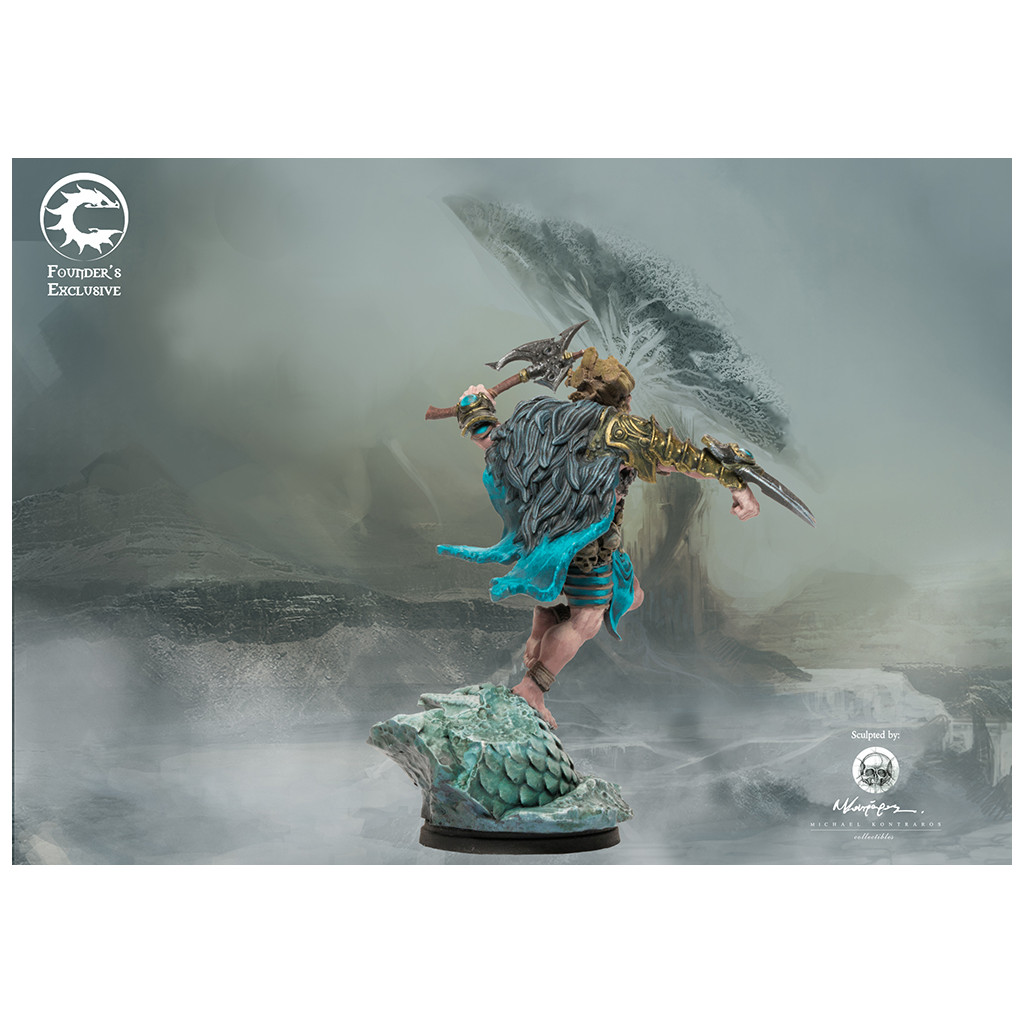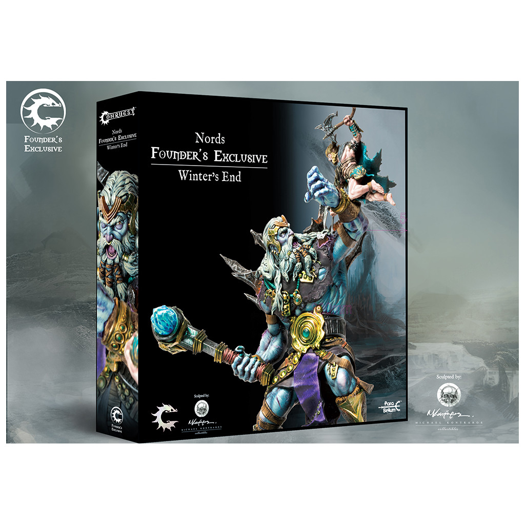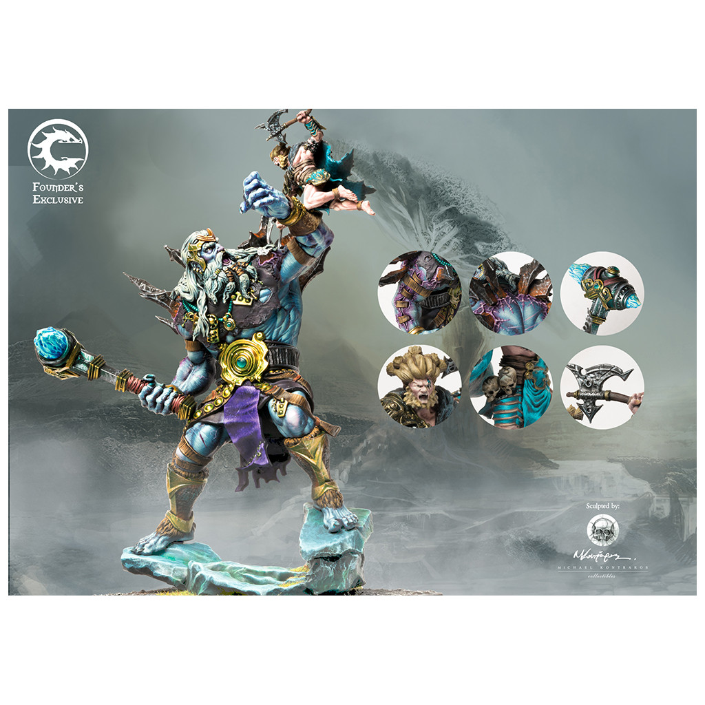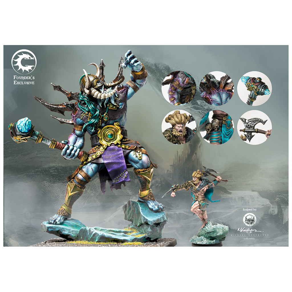 Depitcing the climax of that famous duel, Winter’s End lets you field Alvaldi (as an Ice Jotnar) and 2 Angjorns (as a Konungyr or Blooded) one may be used individually in battle and the other depicting him mid leap in the thick of the action! You are getting 3 models, that form a diorama that may be magnetized by the user (we are providing the connection points which may be further reinforced with magnetization). Each Alvaldi comes with an Alternate Head for further customization.