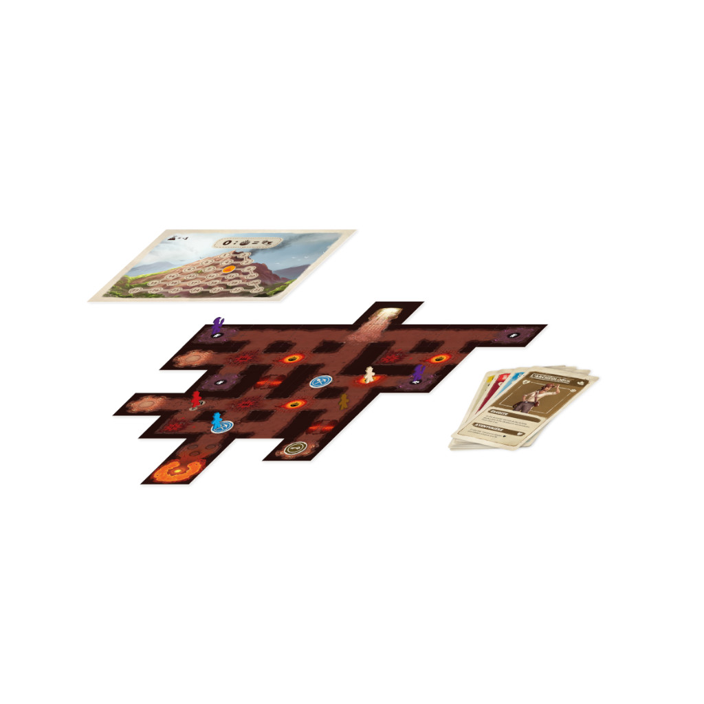 Players must collectively locate and obtain 3 'keys', mysterious objects that are needed to gain entry to the chamber containing the legendary artifact. Your adventures must be quick, though, as the volcano stirs and as the game progresses you get closer to the volcano erupting, flipping tiles to completely inhospitable lava flows that will chase the adventurers from the cave.