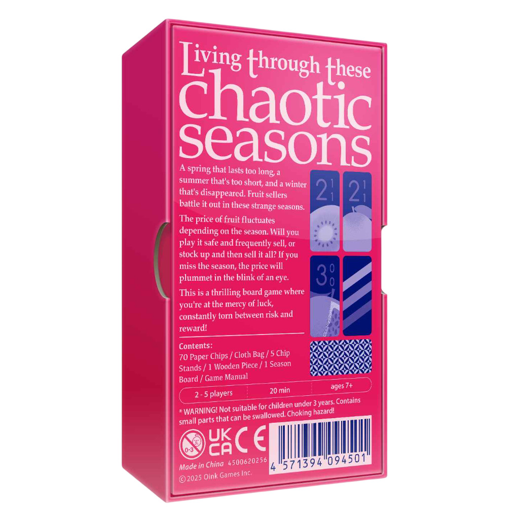 Tropichaos is a game that involves collecting and selling fruit in a world where the seasons are out of whack, with winter completely absent and the other seasons following each other in random order. Players take on the role of fruit sellers and try to earn points by selling their fruit at the right time, during its peak season. The player with the most points wins the game.