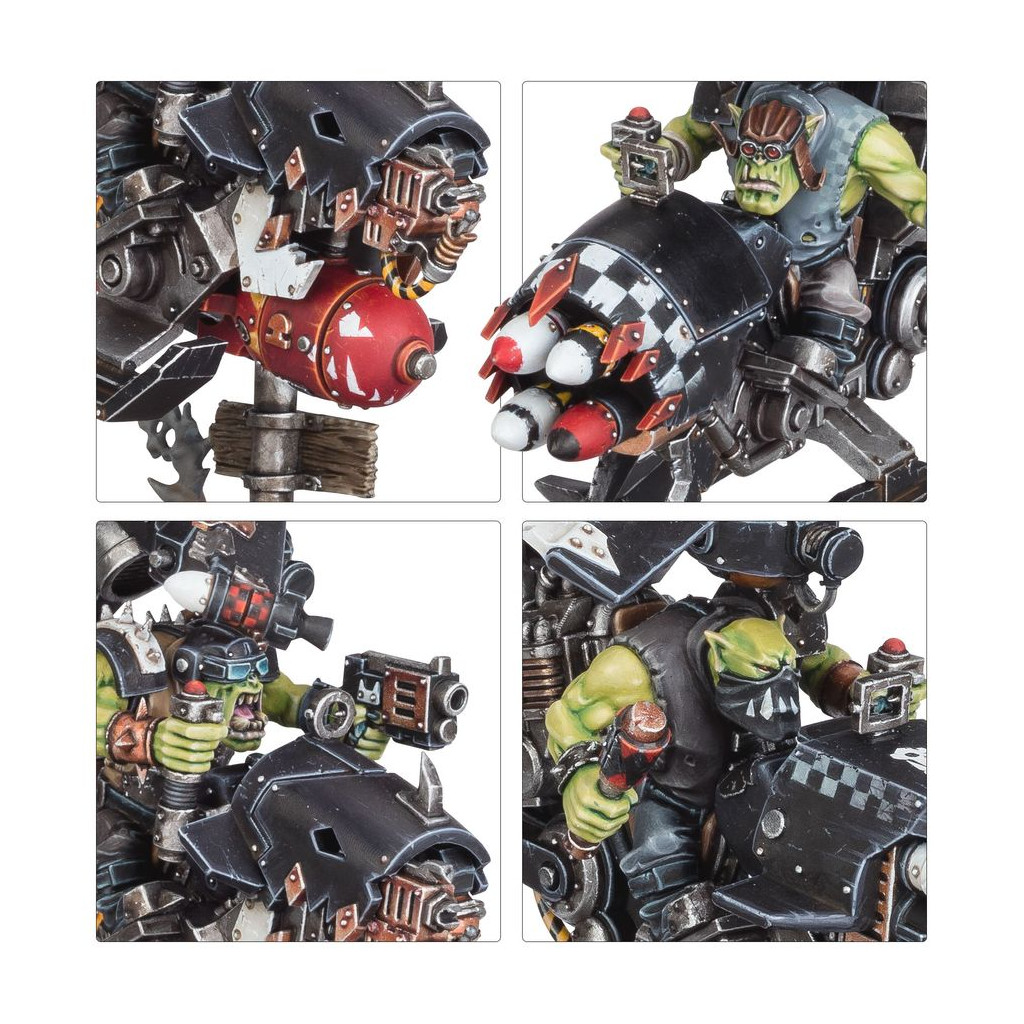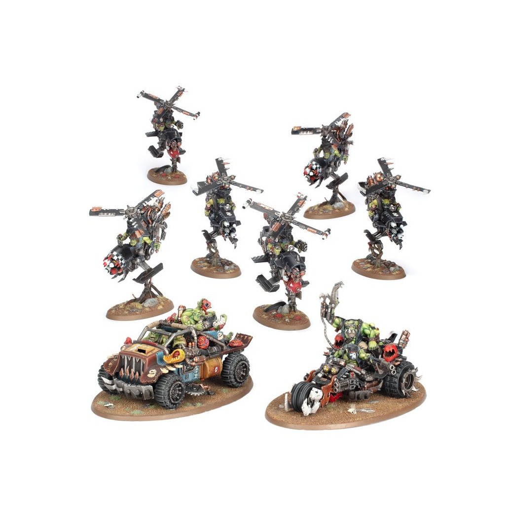 This thrilling boxed set is ideal for starting a new Orks collection – or expanding an existing army – to unleash in games of Warhammer 40,000, and save money compared to buying the kits separately. The force is built around a core of Deffkoptas, rapid-response vehicles ideal for harassing the foe and grabbing objectives. A Deffkilla Wartrike is equipped to get to grips with the enemy fast, with a mix of weapons designed for short-range devastation. One Rukkatrukk Squigbuggy rides in support, lobbing live squigs at the enemy to sow chaos and destruction. When taken together, they are swift, hard-hitting, and ideal for representing a Speedwaaagh! Detachment – the rules for which are found in Armageddon: The Return of Yarrick – Detachments, which is available separately.
