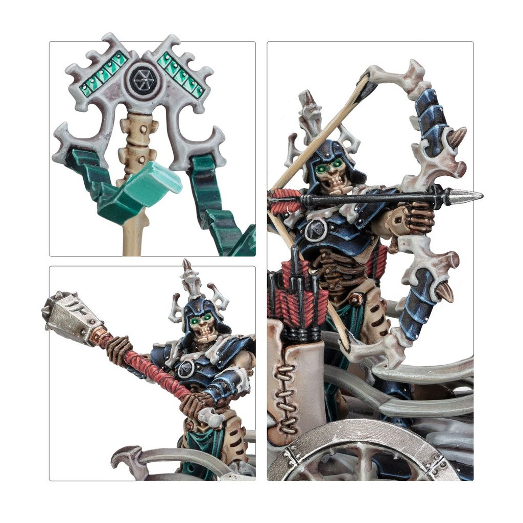 This multipart plastic kit builds a Liege-Kavalos on War Chariot, a swift and powerful leader for your Ossiarch Bonereapers armies in games of Warhammer Age of Sigmar. Able to keep up with the fastest elements of your army, they inspire nearby units while also adding their own prodigious strength and skill to your cavalry and chariot charges. As befitting their status, the Liege-Kavalos is clad in the finest suit of bespoke armour and their chariot is decorated with gems and heraldry.