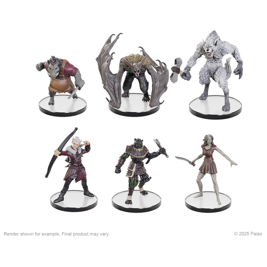 Hunt through Golarion's wilderness with the new Pathfinder Battles: Forest Stalkers pre-painted miniatures set! This set features an Elf Hunter, Catfolk Bandit, Buso, Werebat, Wereboar, and Werewolf.