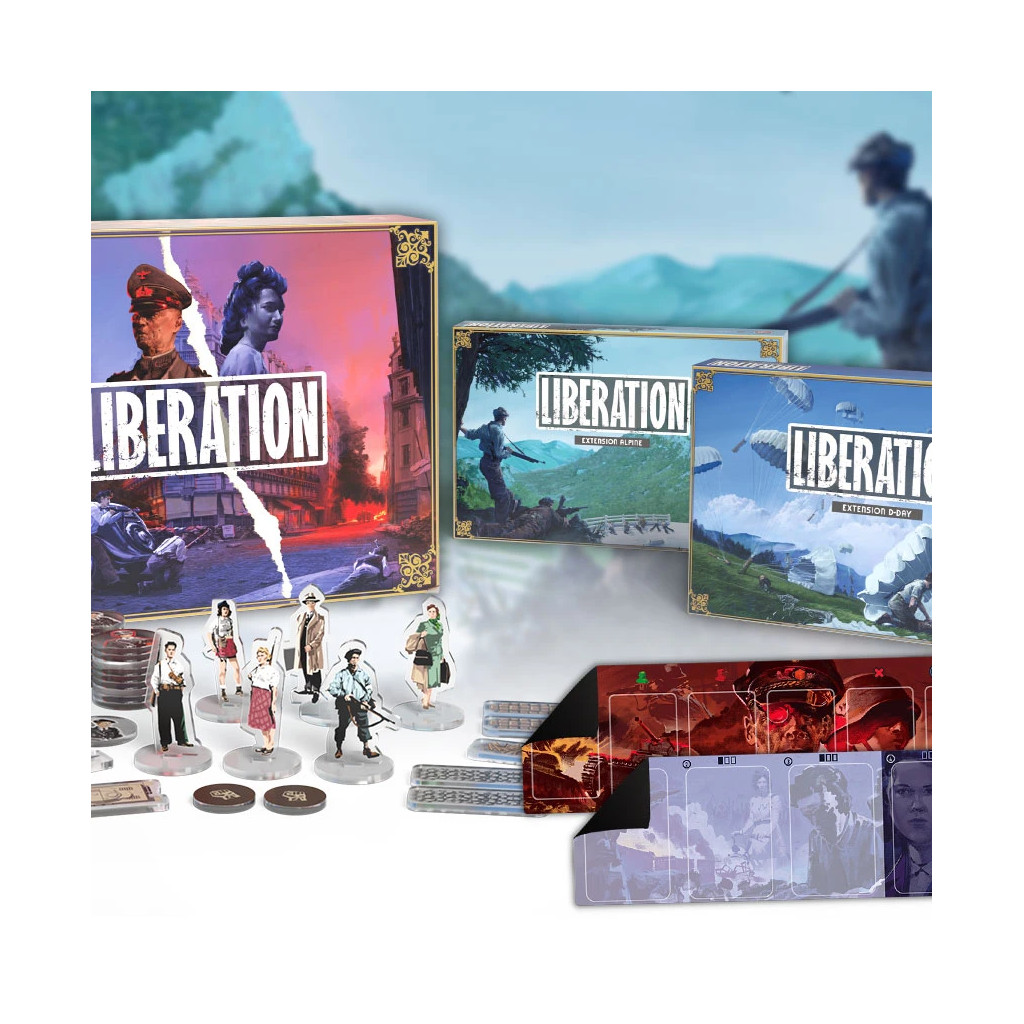 Liberation features an asymmetrical confrontation between the occupying forces and the French Resistance. The occupier can be played by one player or in the form of an automa. The Resistance players each lead their own maquis, fighting together to liberate the country. In a cat-and-mouse game, the Resistance fighters carry out missions while the occupying forces set traps and capture the brave fighters.