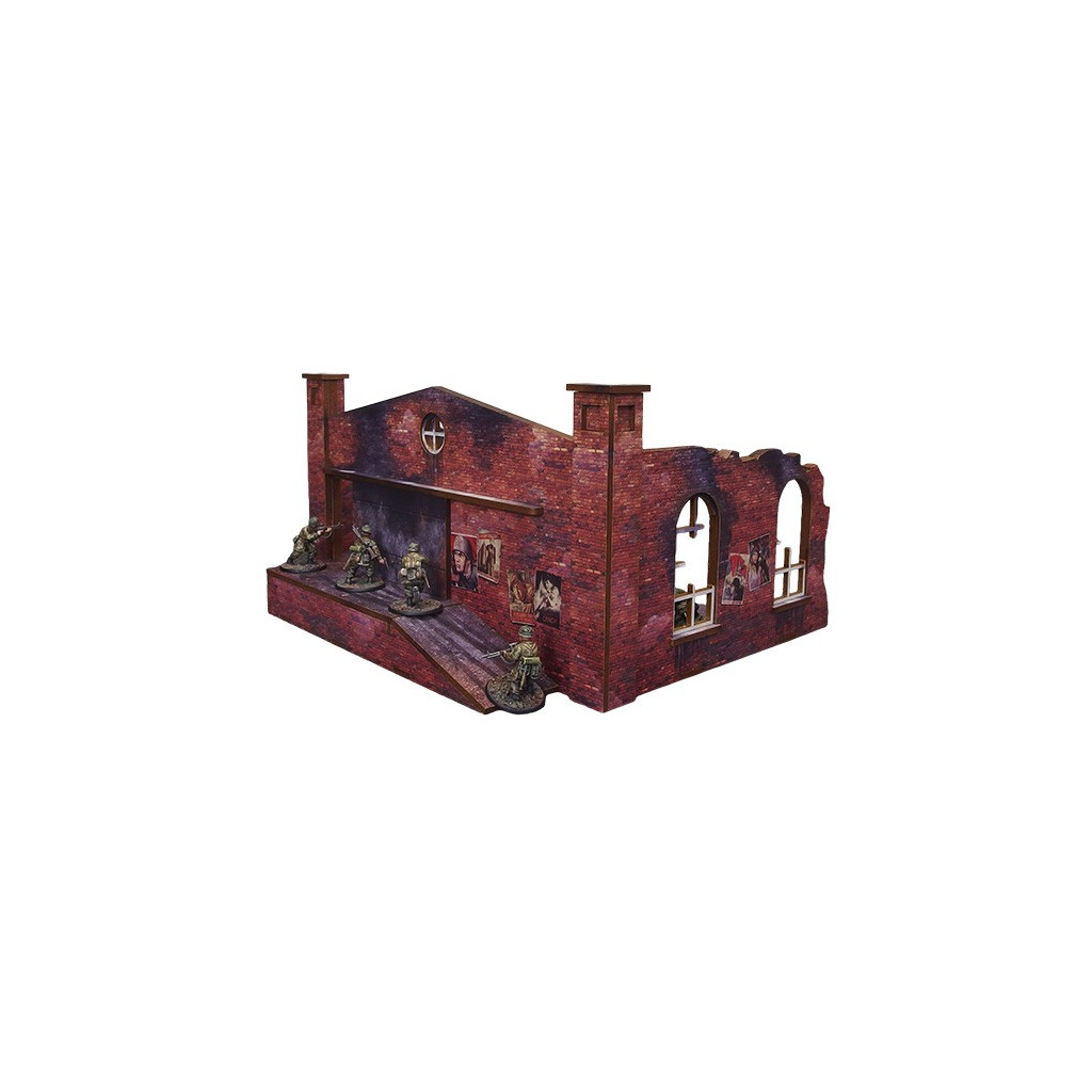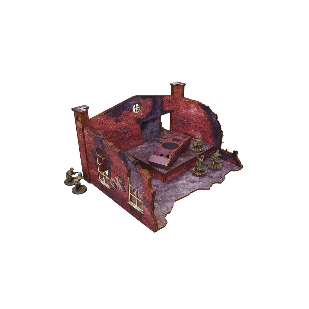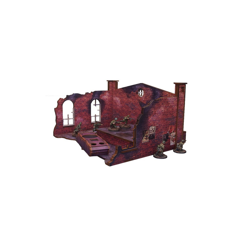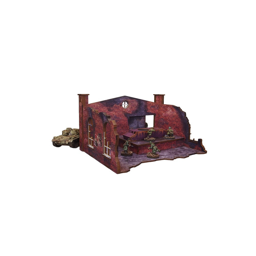 Multicolor prepainted (UV-printed) WW2 Ostfront Stalingrad Factory Back (with ramp) is a part of a ruined manufactory building with a ramp and bare tank hull that forms a full ruined factory together with Stalingrad Factory Front