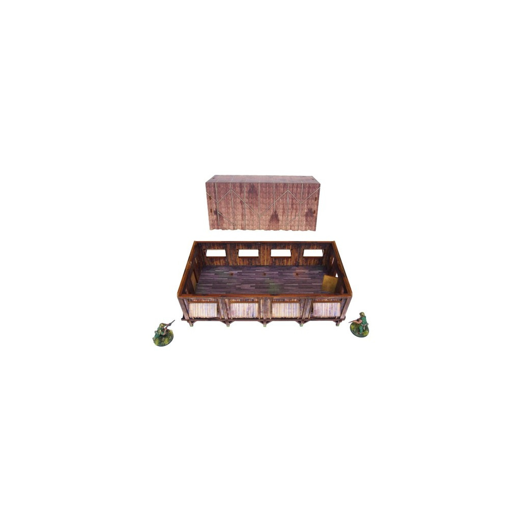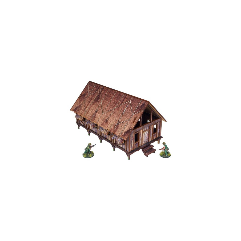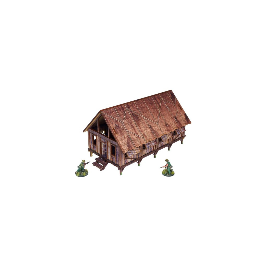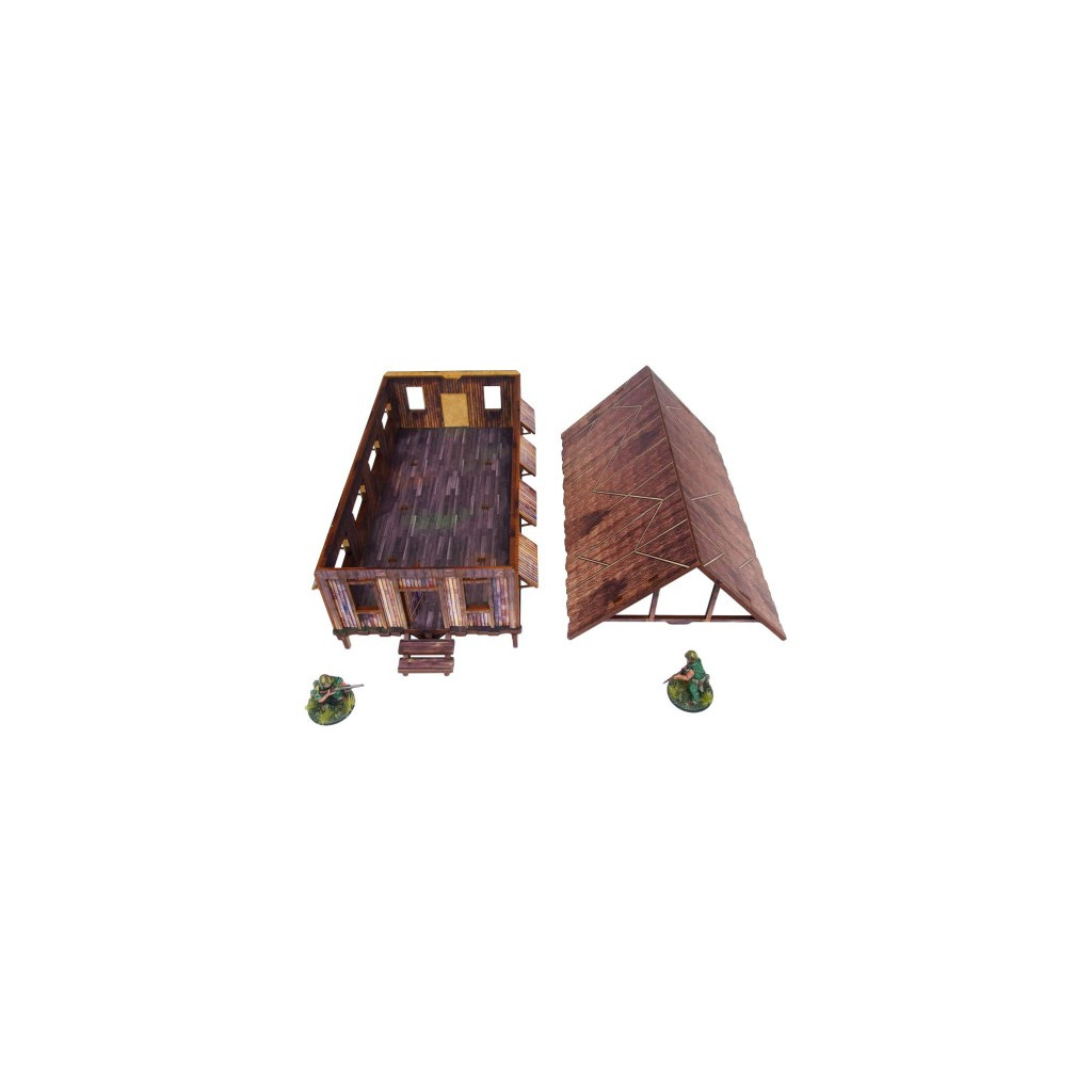 Multicolor prepainted (UV-printed) WW2 Pacific Jungle Barracks (1) is a simple thatched roof building mounted on stilts, pefect to represent common South East Asia and Oceania architecture of 20th century.