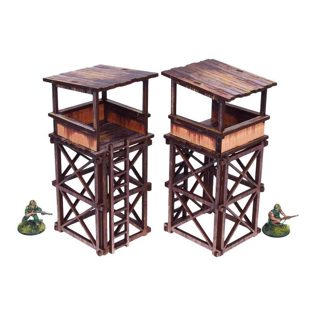 Multicolor prepainted (UV-printed) WW2 Pacific Guard Towers (2) are 2 elevated watchtowers with a ladder, pefect to represent common South East Asia and Oceania architecture of 20th century.