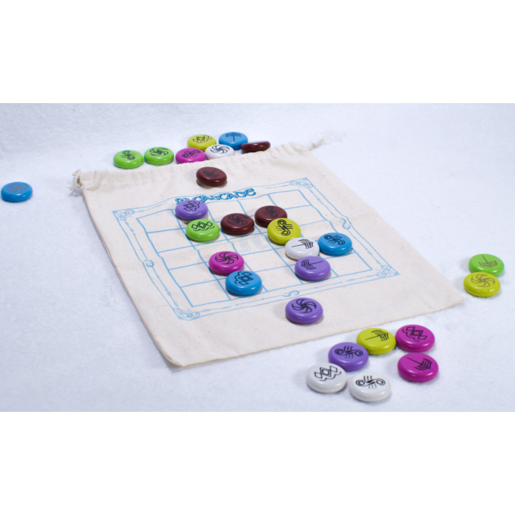 With games lasting 20 minutes for 1 to 4 players, Sagascade offers a tactical challenge that combines simplicity and depth. The principle is as follows: each player has coins with distinct colors and symbols. Each symbol has a unique effect that influences the other stones already on the board. Your objective? Create alignments of three pieces identical in color or symbol to score points.