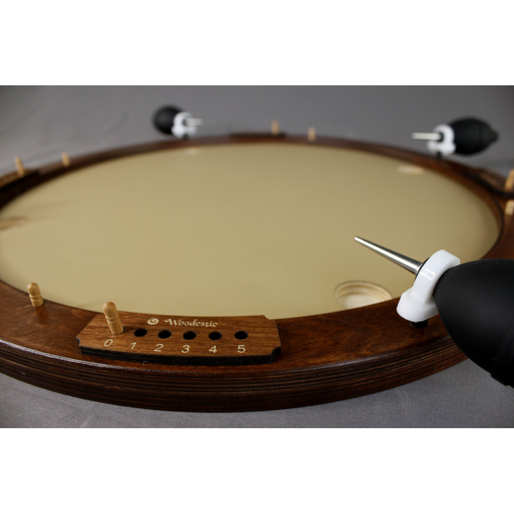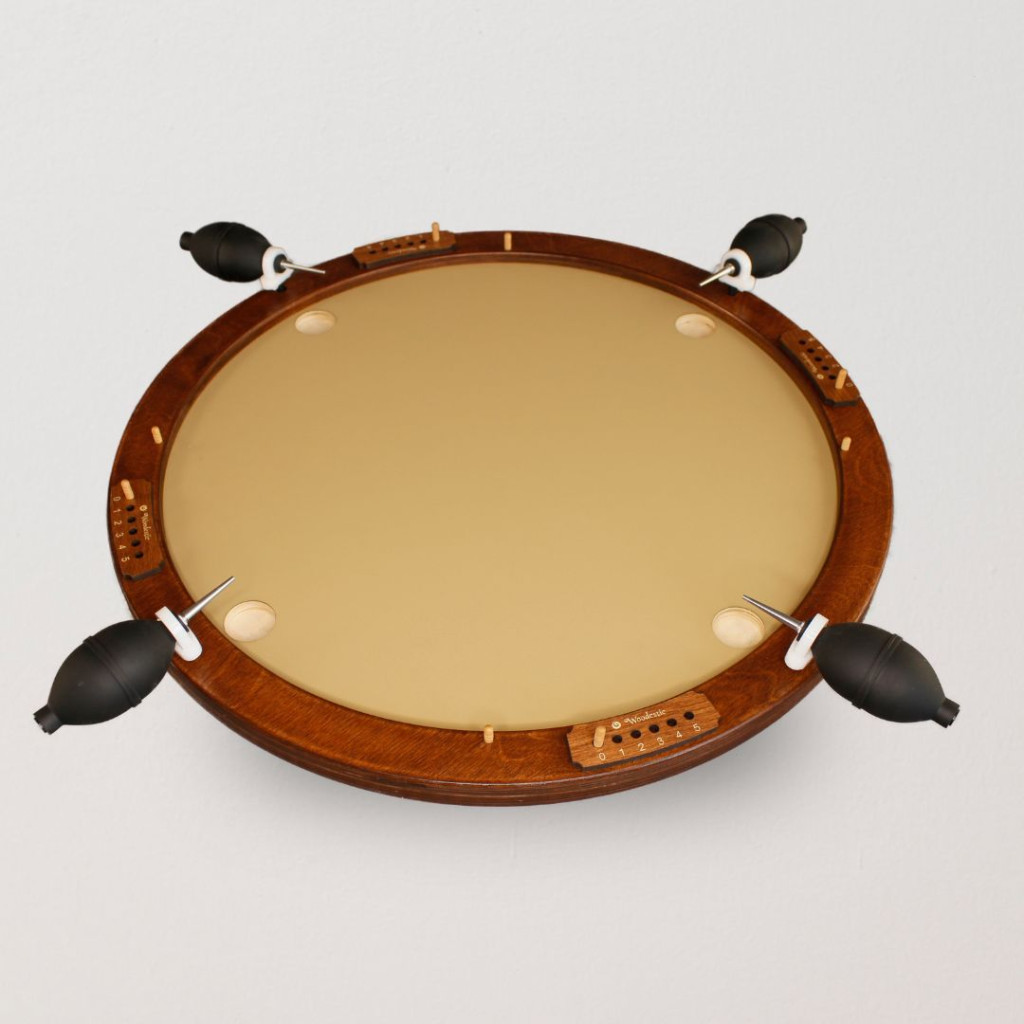 The Woodestic Puff Billiards Mini boards are made from birch plywood and covered with faux leather. The leather is water and UV-proof, its Martindale indicator is 300.000. The ditches are hand-painted and finished with lacquer. The puffers are made from aluminum tubes and rubber. The puffer holders are made from acrilyc. The games are 100% vegan.