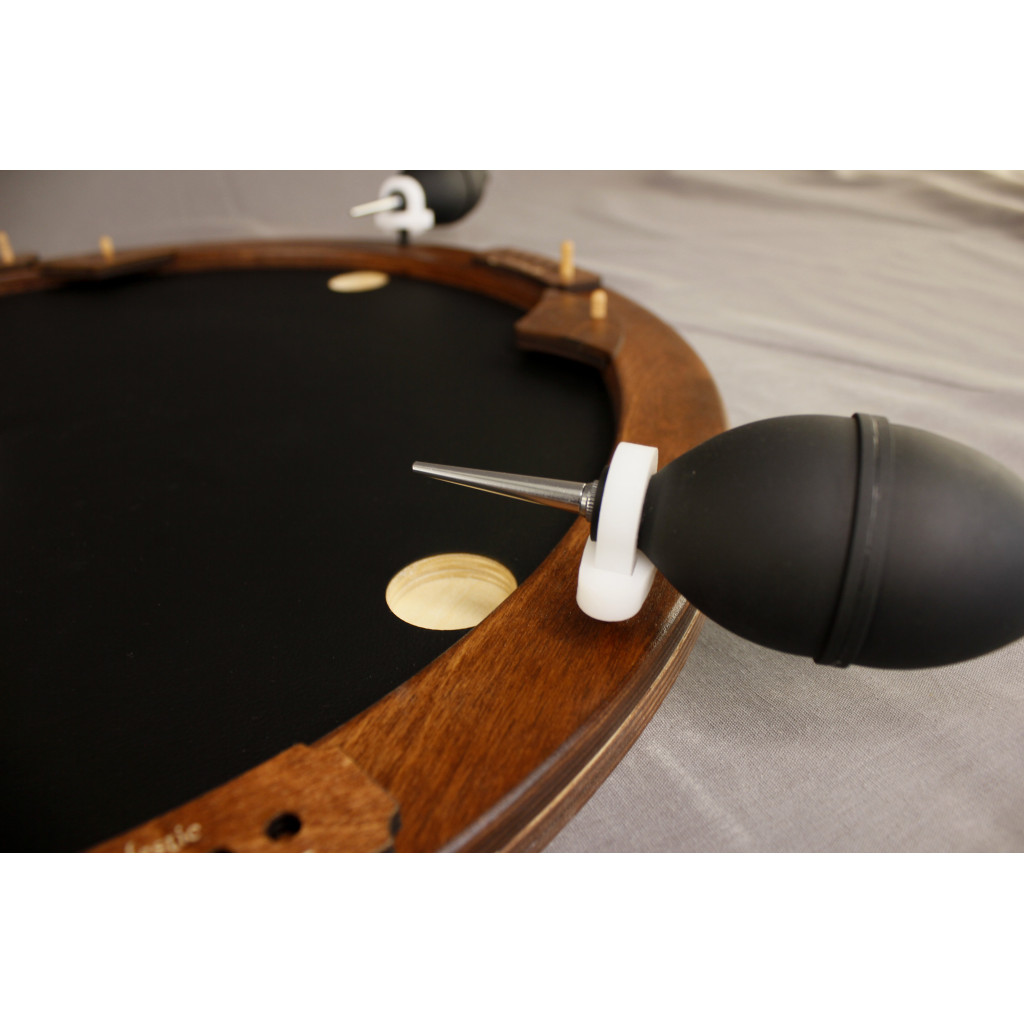 The Woodestic Puff Billiards Mini boards are made from birch plywood and covered with faux leather. The leather is water and UV-proof, its Martindale indicator is 300.000. The ditches are hand-painted and finished with lacquer. The puffers are made from aluminum tubes and rubber. The puffer holders are made from acrilyc. The games are 100% vegan.