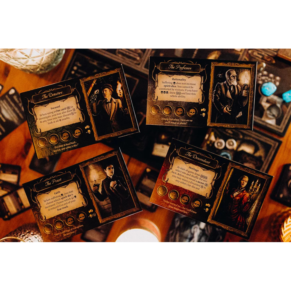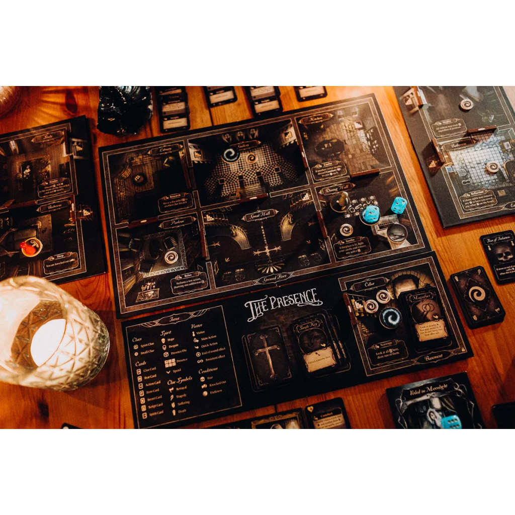 The visitors are represented on the board while the spirit moves through the house ethereally and can be in multiple locations at once. While visitors are limited by doors and passageways, the spirit can move freely, surrounding them. While the spirit-player may have very limited means to communicate, the visitors have an even tougher choice to make. If they separate and go different ways, they will not be able to speak at all. Then, they can only watch on in horror as their friend must make a perilous choice with no support.