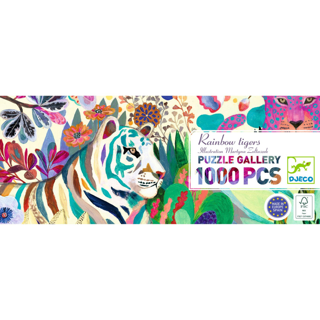 Rainbow Tigers is a 1000-piece puzzle gallery of rainbow tigers in a vibrant jungle.