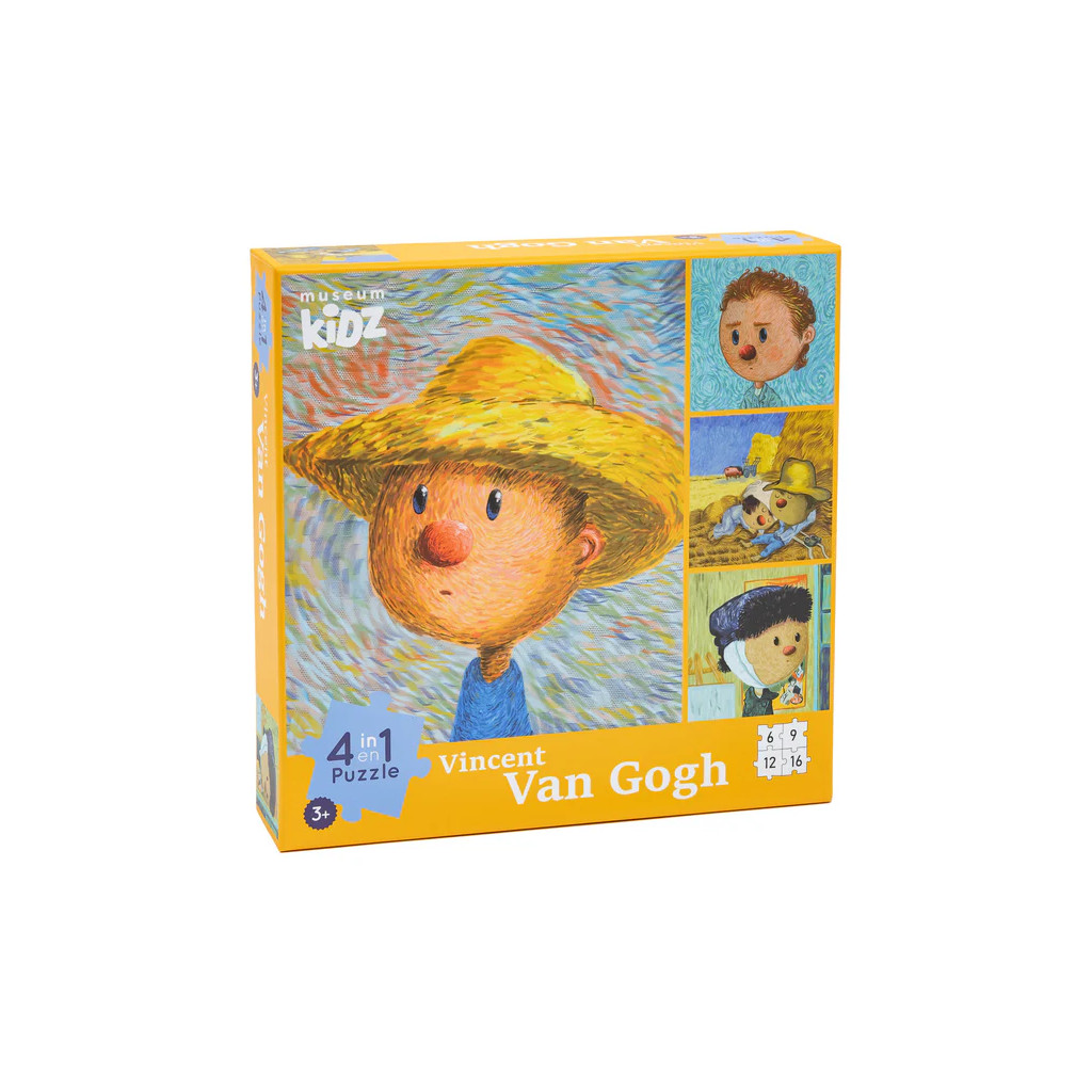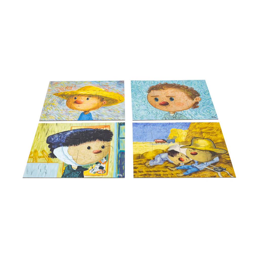 Watch as the vibrant genius of Vincent Van Gogh comes to life before your eyes! Exuding the deep, rich hues and painting style for which he is renowned, these playful reinterpretations of Van Gogh’s Self-Portrait with a Straw Hat, Self-Portrait, Siesta, and Self-portrait with Bandaged Ear come together in a dazzling 4-in-1 puzzle!