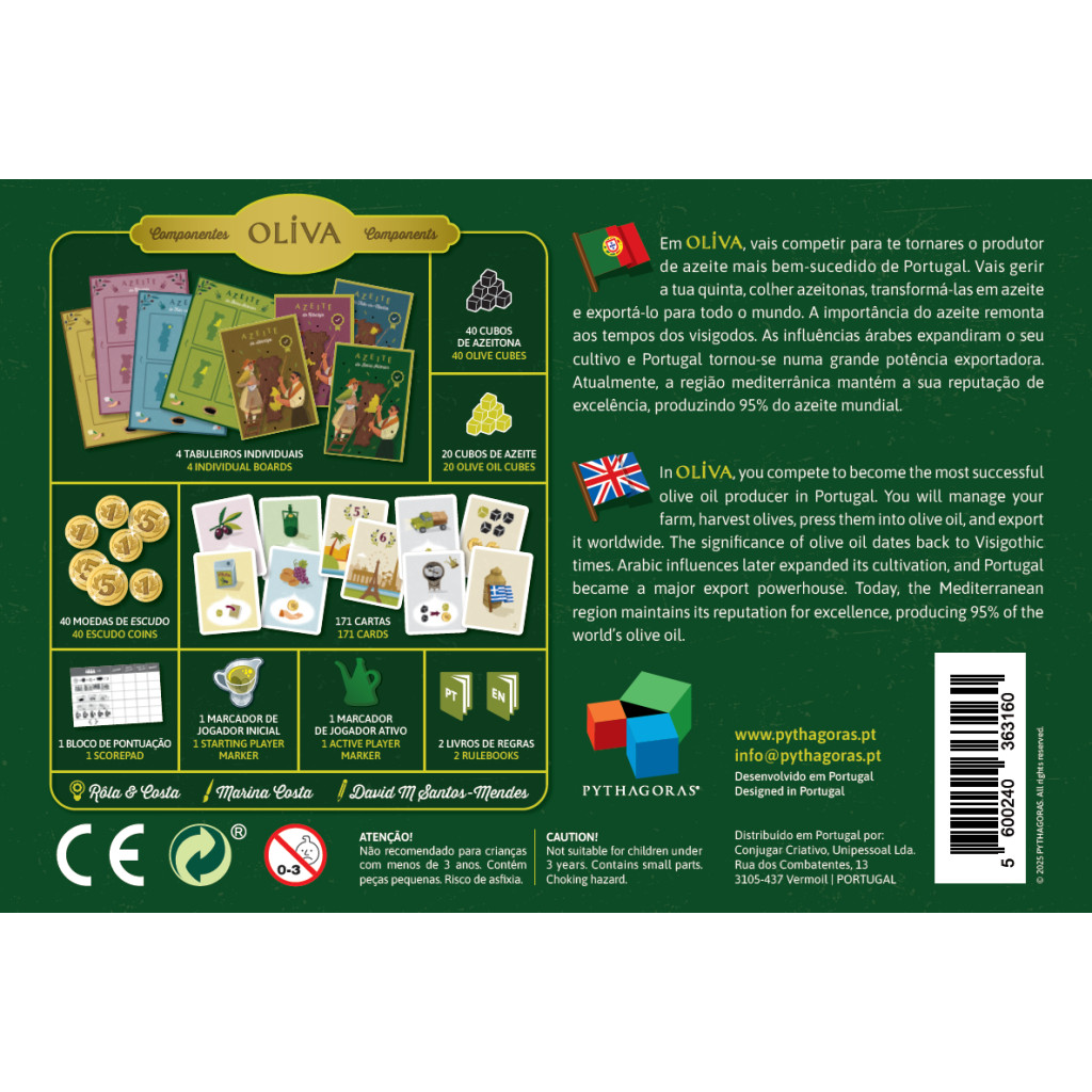 Oliva depicts both traditional and modern production methods, highlighting the productivity of the small olive groves that can still be admired today on the hills of Portugal. The game reflects the scale and quality of olive oil production in the Mediterranean, with Spain approaching Italy's production levels, followed closely by Greece and Turkey.