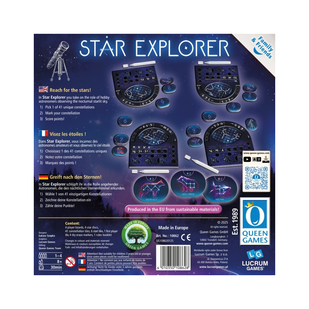 Using rotating trays, each player locates unique constellations as they traverse the celestial sphere. Points are awarded for each constellation accurately recorded, and the player with the highest score wins the title of true Night Sky Explorer.