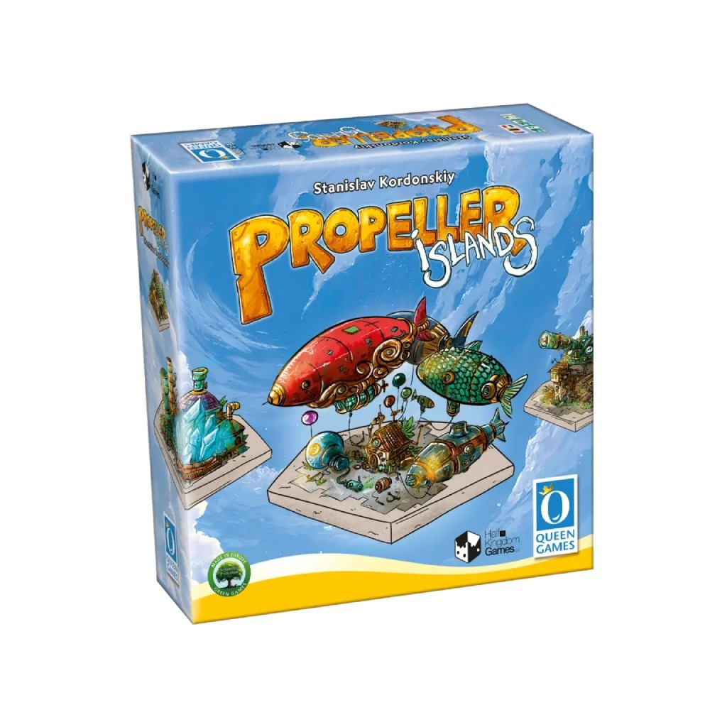 Players take on the role of floating island architects, rolling dice to build whimsical structures, collect resources, and upgrade buildings, unlocking powerful actions as their mechanical island grows.