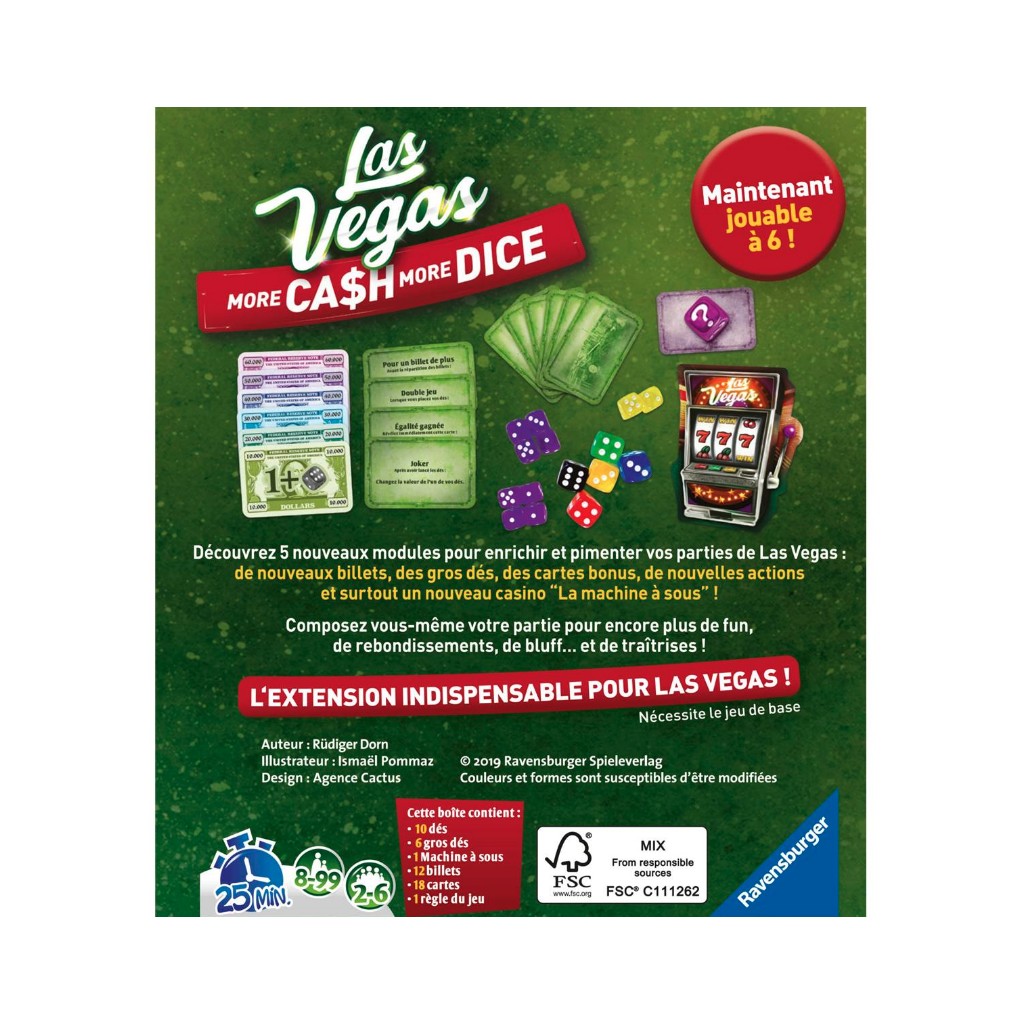In this extension, discover an anthology of new modules to enrich and spice up your Las Vegas games: new $100,000 bills that will certainly attract the covetousness, big dice that are worth double when counting majorities, bonus cards that increase the value of certain tickets, new actions and above all a new casino "The slot machine"! More ca$h more dice also allows you to play up to 6 with a new dice color.