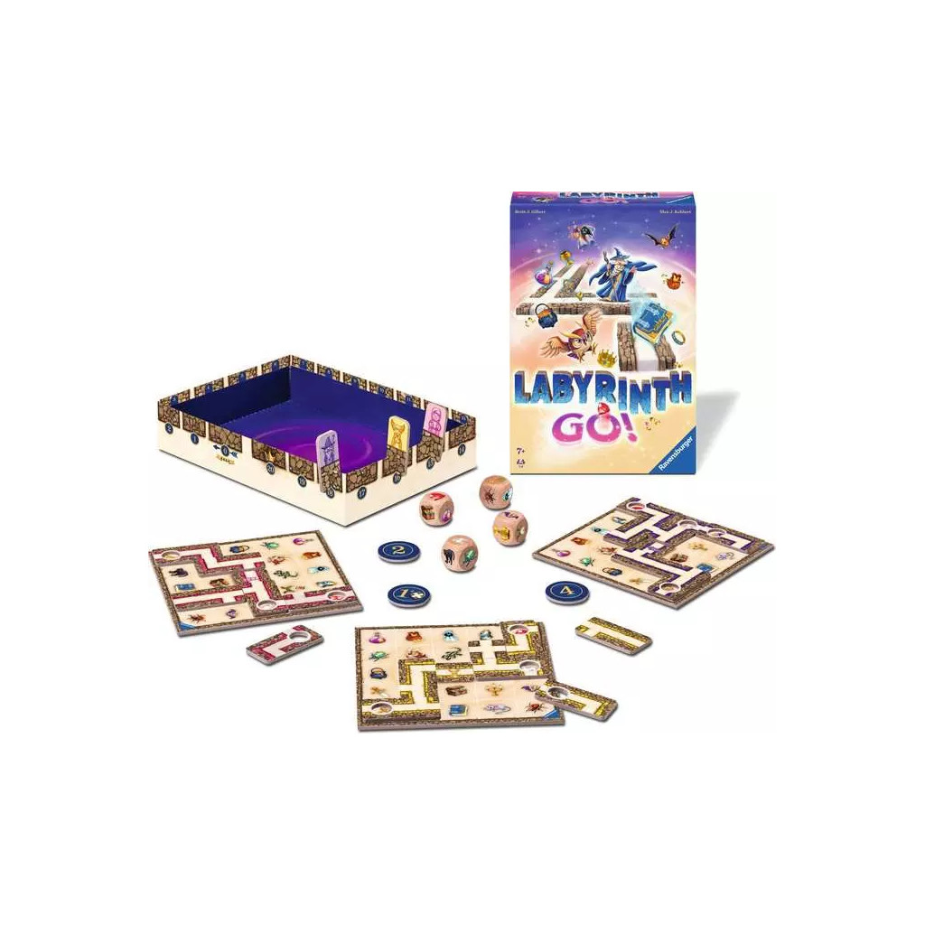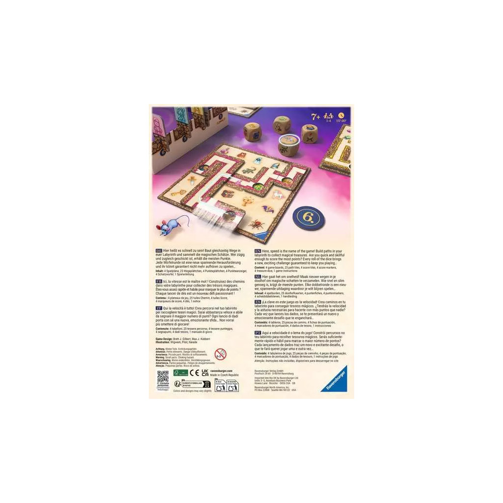 Each round in Labyrinth Go!, the four labyrinth dice reveal which treasures must be collected. Using your own path tiles, you try to connect the treasures shown on the dice with the center of your game board. Whoever does this most quickly earns the most points.