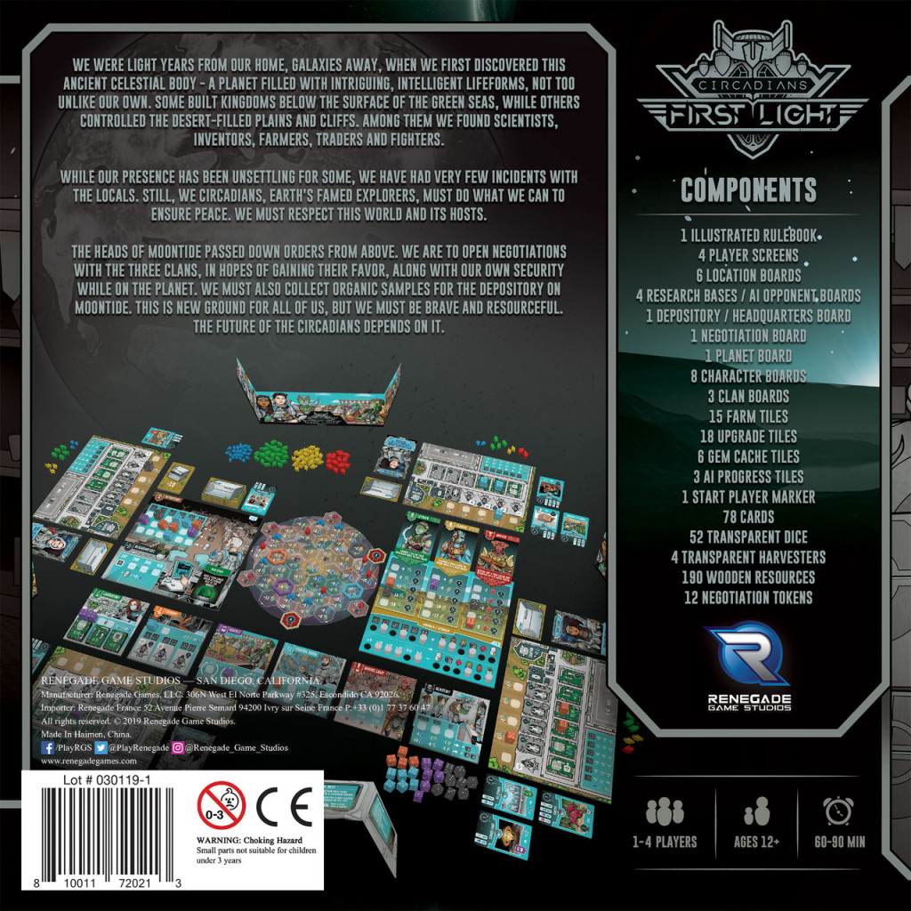 Embark on an interstellar journey with Circadians: First Light, an enthralling board game by Renegade Game Studios that immerses players in a distant world teeming with fascinating lifeforms. Light years away from Earth, this ancient celestial body unfolds a captivating narrative as you navigate through kingdoms beneath green seas and traverse desert-filled plains and cliffs. As Circadians, Earth's renowned explorers, your mission is to establish peace, gain favor with three distinct clans, and ensure your security on this mysterious planet.